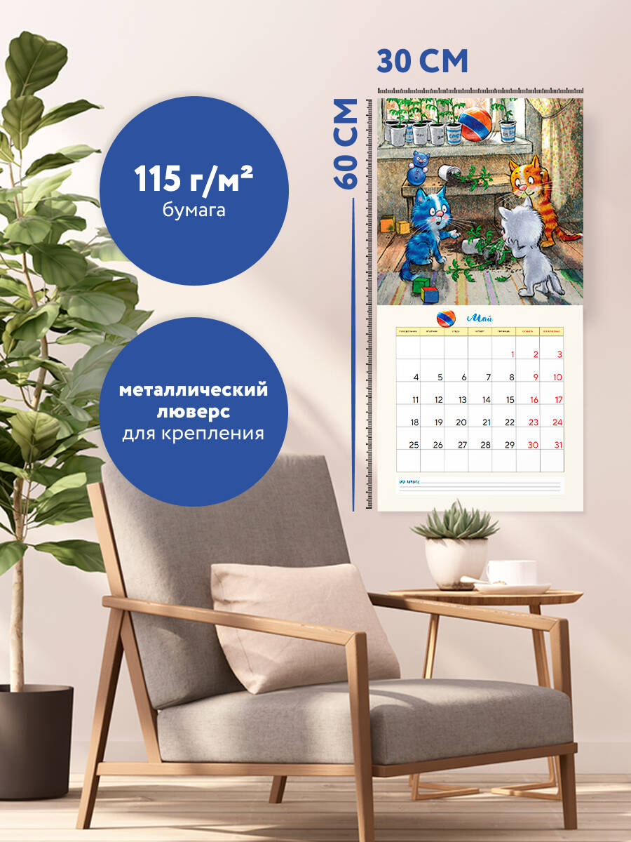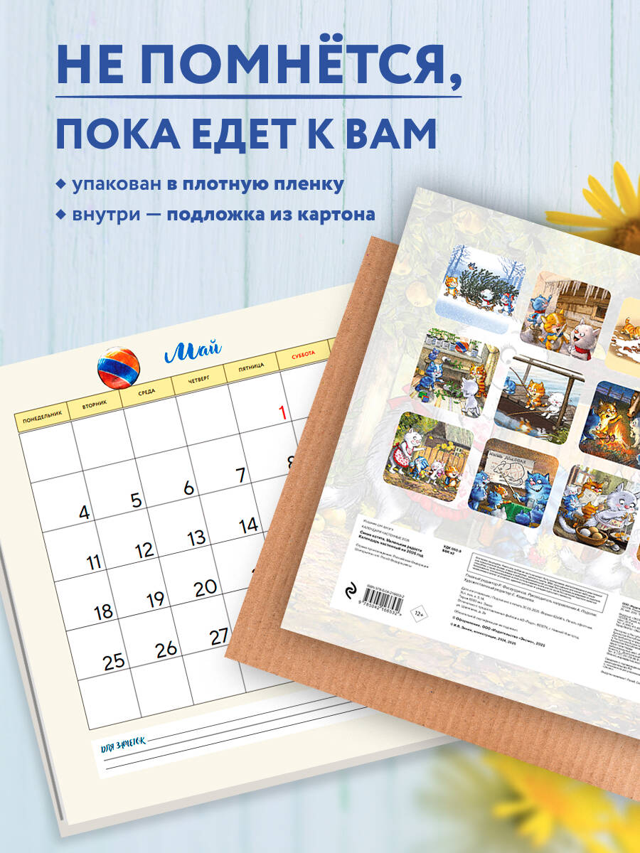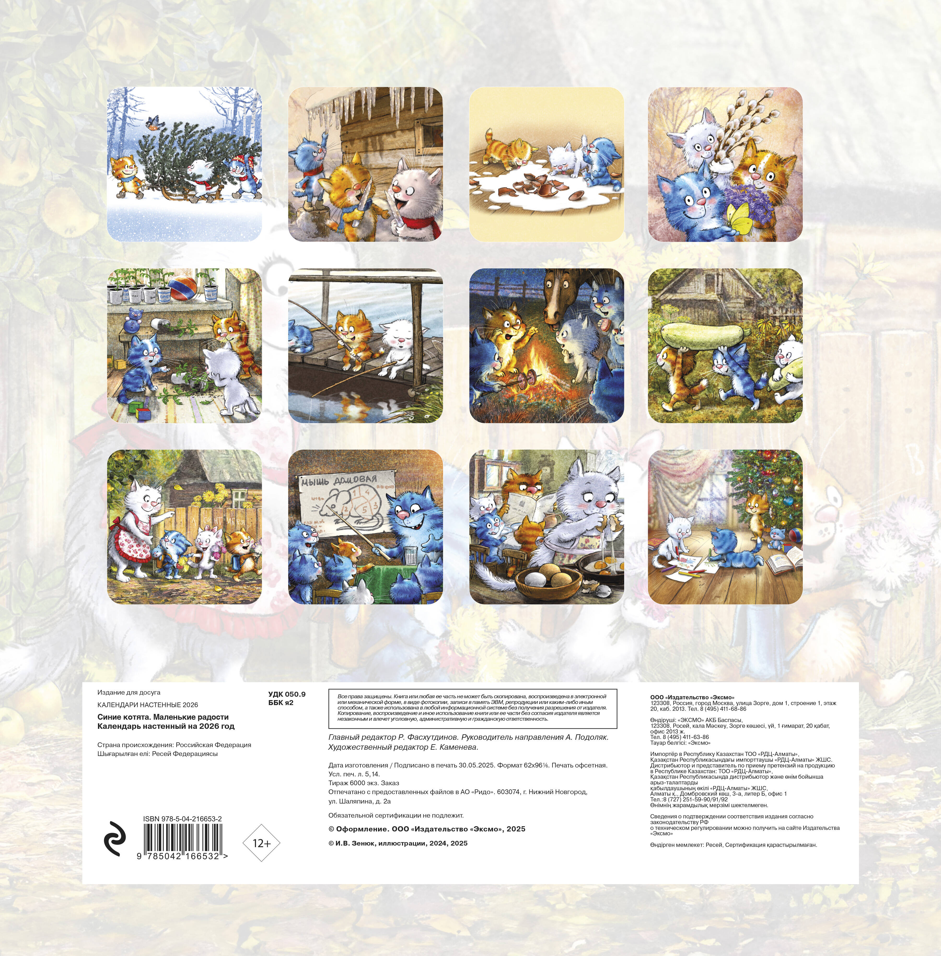 О серии: Наши настенные календари отличаются высоким качеством исполнения! Тщательно подобранные иллюстрации, напечатанные на глянцевой бумаге высочайшего качества, станут настоящим украшением дома, а в календарной сетке найдется место для ваших планов: большие клетки позволят делать записи и организовать свой год! В календаре также отмечены все государственные праздники. О календаре: Забавный милый календарь с зарисовками из жизни многодетной семьи знаменитых Синих Котов, завоевавших любовь тысяч поклонников в различных интернет-сообществах. Рина Зенюк - минская художница, герои ее рисунков - веселые и серьезные, решительные, мечтательные, очень упитанные коты синего цвета - понравятся не только заядлым любителям котиков, но и тем, кто до этого был к ним равнодушен. Свой жанр художница определяет как «котизм». Синие коты гарантированно дарят хорошее настроение и не оставят равнодушным никого! Для кого: Для всех поклонников творчества Рины Зенюк и ее замечательных синих котов! Технические параметры: - Тип календаря - настенный перекидной. - Год - 2026. - Календарная сетка - с разбивкой по месяцам. - Вид скрепления - скрепка. - Ширина - 30 см. - Высота - 30 см. - Внутренний блок - мелованная бумага 115 г/м2. - Подложка - плотный гофрокартон для поддержания формы. - Индивидуальная упаковка в плотный целлофановый пакет.| Издательство | ООО "Издательство "Эксмо" |