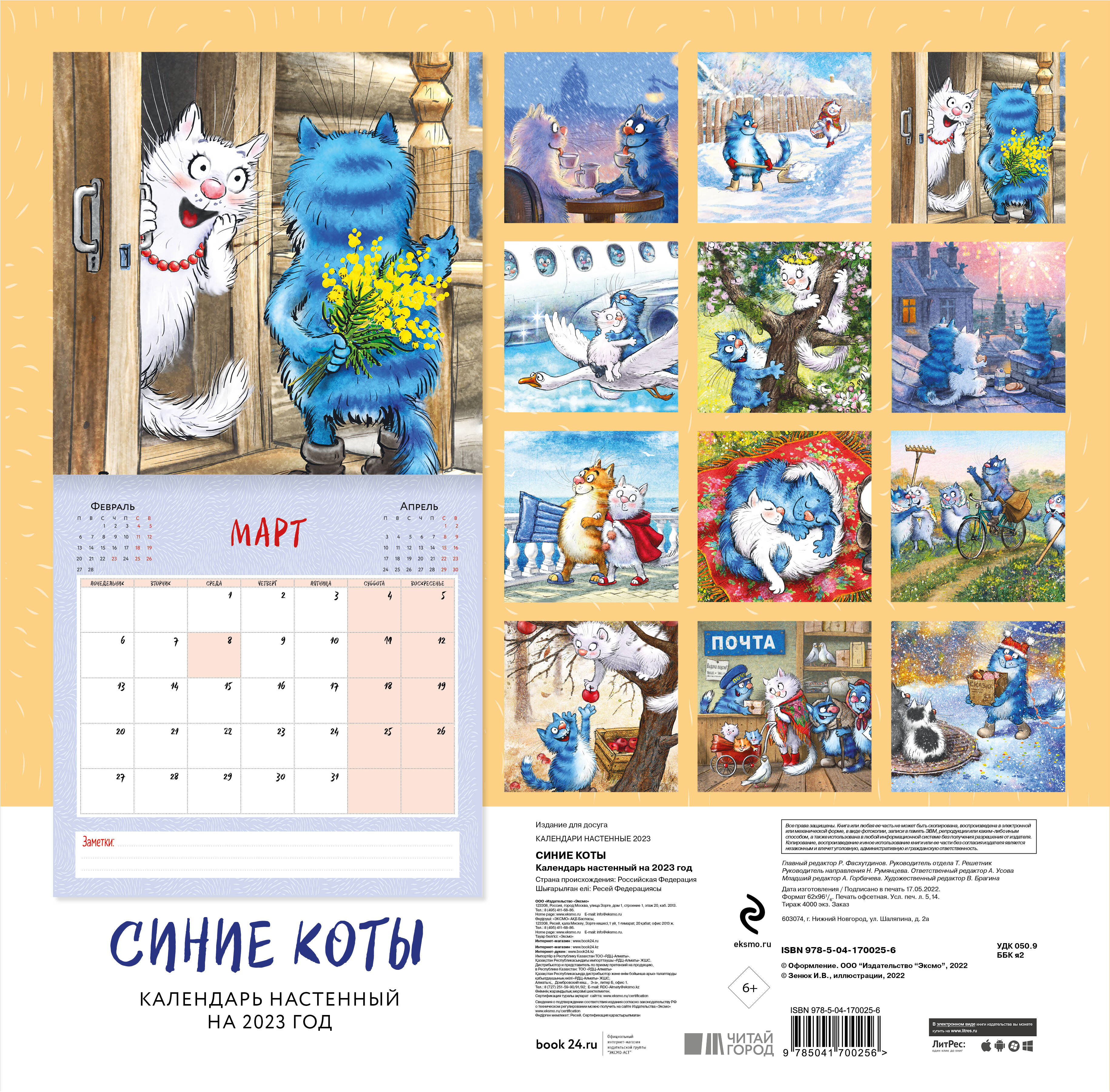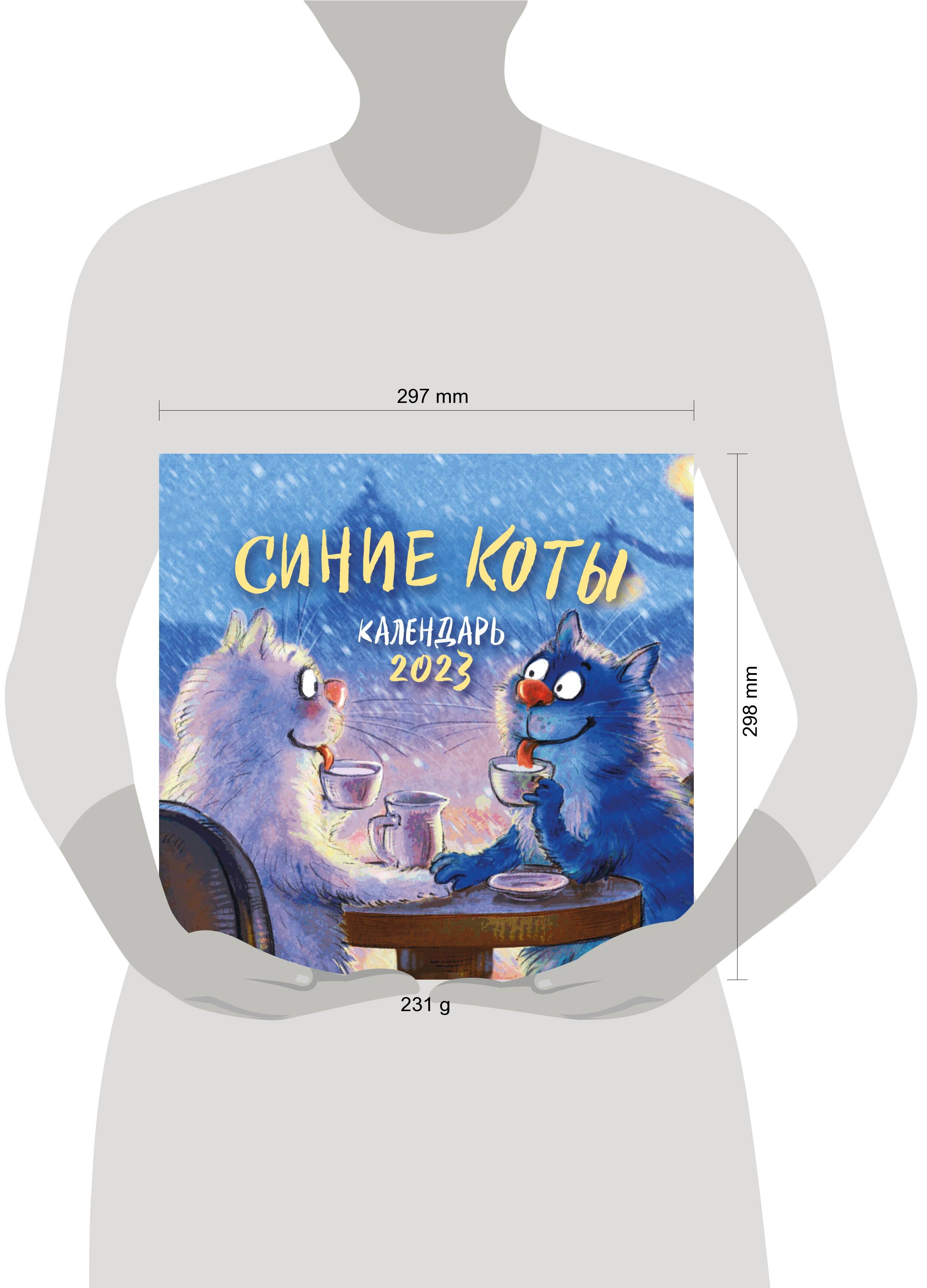 О серии: Наши настенные календари отличаются высоким качеством исполнения! Тщательно подобранные иллюстрации, напечатанные на глянцевой бумаге высочайшего качества, станут настоящим украшением дома, а в календарной сетке найдется место для ваших планов: большие клетки позволят делать записи и организовать свой год! В календаре также отмечены все государственные праздники. О календаре: Практичный и эстетичный, этот календарь каждый месяц будет радовать вас. Рина Зенюк - минская художница, автор знаменитых Синих Котов, завоевавших любовь тысяч поклонников в различных интернет-сообществах. Герои рисунков Рины Зенюк - веселые и серьезные, решительные, мечтательные, очень упитанные коты синего цвета - понравятся не только заядлым любителям котиков, но и тем, кто до этого был к ним равнодушен. Свой жанр художница определяет как «котизм». Синие коты гарантированно дарят хорошее настроение и не оставят равнодушным никого! Для кого: Для всех поклонников творчества Рины Зенюк и ее прекрасных синих котов! Технические параметры: - Тип календаря - настенный перекидной. - Год - 2023. - Календарная сетка - с разбивкой по месяцам. - Вид скрепления - скрепка. - Ширина - 30 см. - Высота - 30 см. - Внутренний блок - мелованная бумага 150 г/м2. - Подложка - плотный гофрокартон для поддержания формы. - Индивидуальная упаковка в плотный целлофановый пакет.| Издательство | Эксмо |