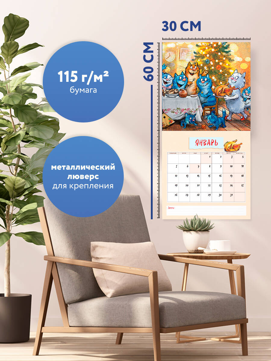 О серии: Наши настенные календари отличаются высоким качеством исполнения! Тщательно подобранные иллюстрации, напечатанные на глянцевой бумаге высочайшего качества, станут настоящим украшением дома, а в календарной сетке найдется место для ваших планов: большие клетки позволят делать записи и организовать свой год! В календаре также отмечены все государственные праздники. О календаре: Забавный милый календарь с зарисовками из жизни многодетной семьи знаменитых Синих Котов, завоевавших любовь тысяч поклонников в различных интернет-сообществах. Рина Зенюк - минская художница, герои ее рисунков - веселые и серьезные, решительные, мечтательные, очень упитанные коты синего цвета - понравятся не только заядлым любителям котиков, но и тем, кто до этого был к ним равнодушен. Свой жанр художница определяет как «котизм». Синие коты гарантированно дарят хорошее настроение и не оставят равнодушным никого! Для кого: Для всех поклонников творчества Рины Зенюк и ее замечательных синих котов! Технические параметры: - Тип календаря - настенный перекидной. - Год - 2026. - Календарная сетка - с разбивкой по месяцам. - Вид скрепления - скрепка. - Ширина - 30 см. - Высота - 30 см. - Внутренний блок - мелованная бумага 115 г/м2. - Подложка - плотный гофрокартон для поддержания формы. - Индивидуальная упаковка в плотный целлофановый пакет.