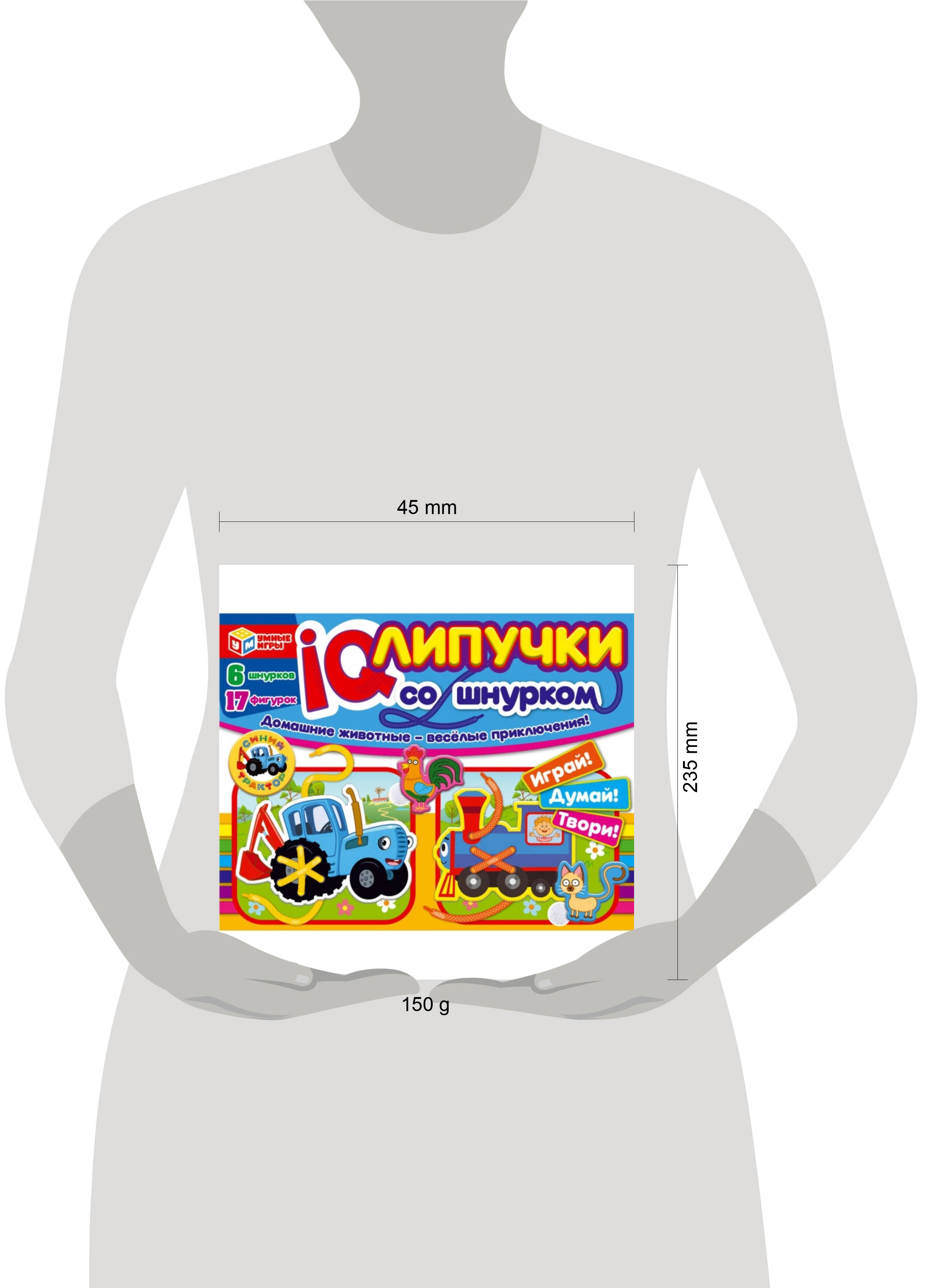 IQ-липучки со шнурком "Синий Трактор. Весёлые приключения" ТМ "Умные игры" - отличный развивающий подарок для маленьких любознаек: - 6 шнурков - 17 фигурок - любимые персонажи - 3 в 1: играй, думай, твори В состав набора входят вырубные фигуры-основы, к ним прилагаются дополнительные элементы на текстильных липучках и 6 разноцветных шнурков. Главная цель этой игры - развитие мелкой моторики ребёнка. Липучки и шнурки в составе набора помогут развить координацию движений кистей рук и пальцев. Чтобы начать играть, необходимо вынуть всё содержимое из коробки. Предложите ребёнку самостоятельно выбрать, с чего начать. Положите перед ним все необходимые детали. Покажите ему изображение собранных вместе деталей на обороте коробки. Собирайте фигуры согласно следующей инструкции: 1. Перед тем, как дать ребёнку в руки игру, прикрепите части липучек на обозначенные пунктирной линией квадраты, а также на обратную сторону прилепляющихся деталей. Теперь ребёнок сможет их соединять. 2. Возьмите в руки детали, на которых есть отверстия для шнуровки. Дайте ребёнку в руки один или два шнурка и детали, которые необходимо прикрепить к основе. Попросите ребенка сделать шнуровку по схемам на упаковке. 3. Предложите ребёнку найти элементы с липучками, прикрепить их на место в соответствии с картинкой. 4. Придумайте вместе с ребёнком небольшую историю про весёлые приключения любимых героев! Игровой набор ТМ "Умные игры" развивает: - мелкую моторику рук - ассоциативное мышление - логику и кругозор - воображение Размер упаковки: 235 х 180 х 45 мм. Материал: картон + текстиль. Рекомендовано детям от 3-х лет.