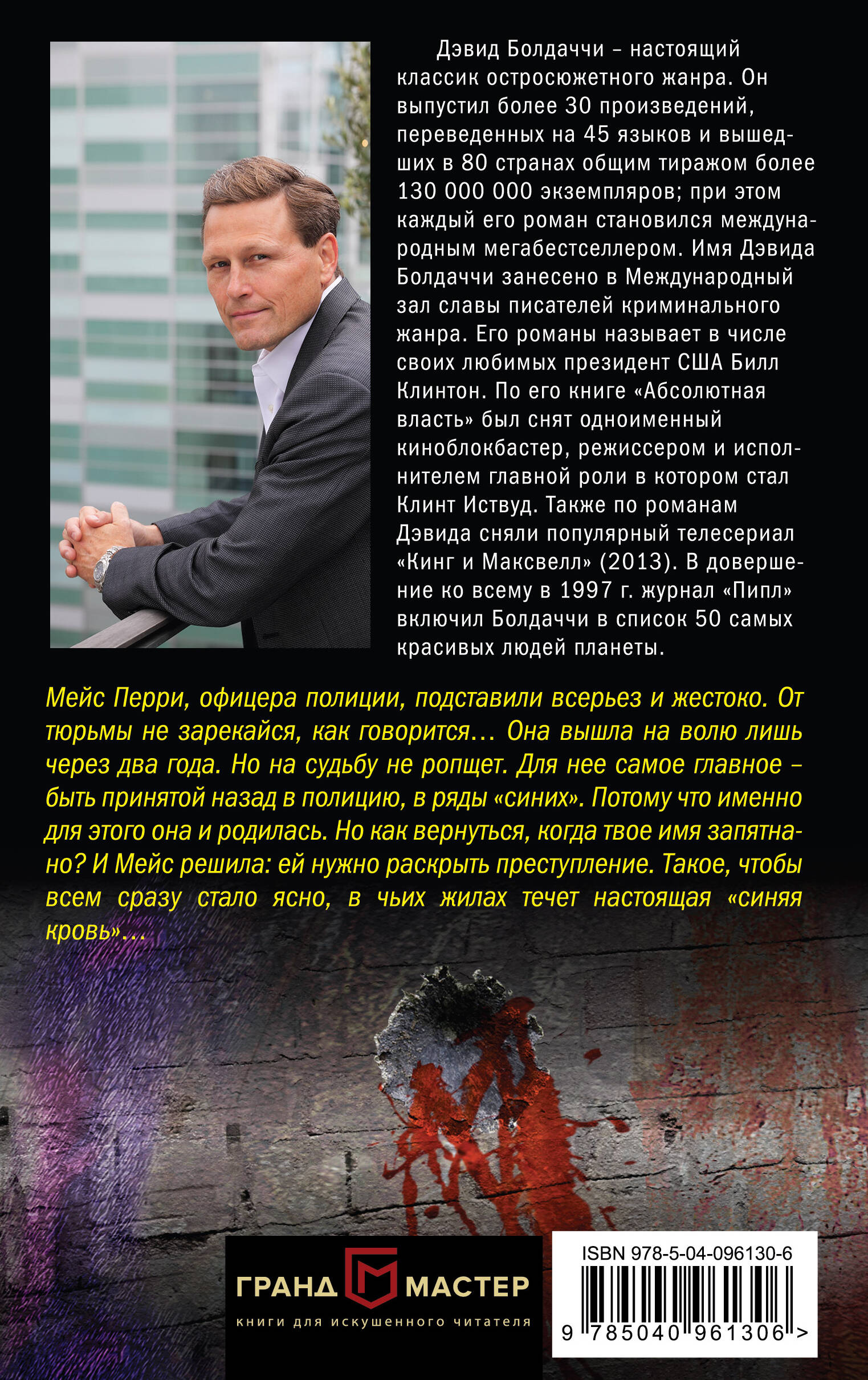 В мире продано более 130 000 000 копий романов автора Бестселлер New York Times #1 Болдаччи движет весь жанр саспенса. People Потрясающий боевик. New York Daily News Мейс Перри, главная героиня романа, умна, по-уличному жестка, и у нее чертовски острый глаз на детали. Richmond Times-Dispatch И снова вы можете произнести слова «Болдаччи», «бестселлер» и «киносценарий», не переводя дыхание. Chicago Sun-Times Болдаччи по-прежнему не имеет себе равных. Sunday Times Один из самых успешных авторов в жанре триллера, Болдаччи попросту не нуждается в представлении. Daily Mail Болдаччи словно бы примеряет кожу своих героев - и поражает нас глубиной своей эмпатии. Sunday Express Дэвид Болдаччи - настоящий классик остросюжетного жанра. Он выпустил более 30 произведений, переведенных на 45 языков и вышедших в 80 странах общим тиражом более 130 000 000 экземпляров; при этом каждый его роман становился международным мегабестселлером. Мейс Перри, офицера полиции, подставили всерьез и жестоко. От тюрьмы не зарекайся, как говорится… Она вышла на волю лишь через два года. Но на судьбу не ропщет. Для нее самое главное - вернуться в полицию, в ряды «синих». Потому что это именно то, для чего она родилась. Но как сделать это, когда твое имя запятнано? И Мейс решила: ей нужно раскрыть преступление. Такое, чтобы всем сразу стало ясно: они в ней крупно ошибались…| Издательство | ООО "Издательство "Эксмо" |