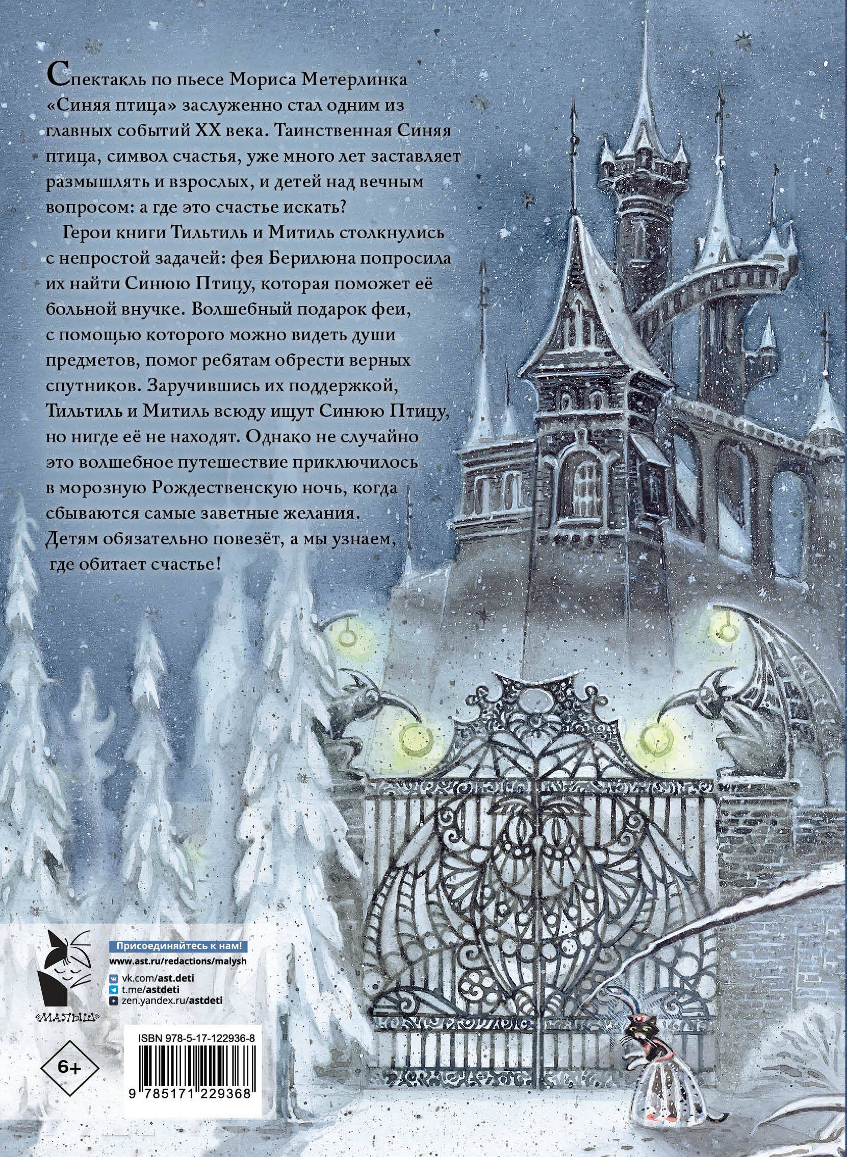 Морис Метерлинк - бельгийский писатель, философ, лауреат Нобелевской премии по литературе. В 1905 году написал пьесу-притчу "Синяя птица", ставшую одним из главных событий XX века: её ставили на сценах театров, снимали фильмы, записывали радиоспектакли. Гражданская жена писателя Жоржетта Леблан сделала из пьесы вариант сказки для детей. Наполненная добротой и верой, сказка о Синей птице, символе счастья и надежд, по сей день продолжает трогать сердца людей и завоёвывать поклонников по всему миру. В Рождественскую ночь в дверь брата и сестры Тильтиля и Митиль постучалась фея Берилюна. Её внучка больна, и поможет ей только Синяя Птица. Но где её искать? Выполнить это непростое задание и предстоит ребятам. На помощь им приходят ожившие Хлеб, Сахар, Огонь и Вода, а ещё верный пёс Тило и хитрая кошка Тилетта. Героям предстоит нелёгкий путь: они заглянут в чертоги Ночи, наведаются в Страну Воспоминаний, побывают в Царстве Будущего. Однако Синей Птицы нигде нет. Где же ты прячешься, Синяя Птица? Пересказ Леонида Яхнина. Иллюстрации Максима Митрофанова. Для среднего школьного возраста.| Издательство | Издательство "АСТ" |