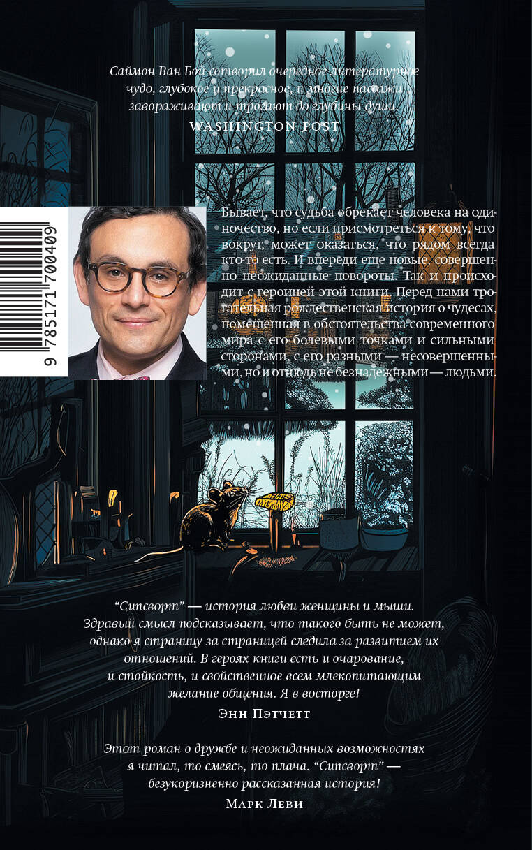 - Трогательный и добрый роман для поклонников книги Фредерика Бакмана «Вторая жизнь Уве» и цикла Ричарда Османа «Клуб убийств по четвергам». - Автор книги Саймон Ван Бой - популярный англо-американский писатель, редактор и преподаватель. Среди его произведений - десятки бестселлеров для взрослых и детей. Книги писателя переведены на 18 языков. - «Сипсворт» - необычная история дружбы пожилой женщины и мышки. Это жизнеутверждающий роман с добрым юмором о надежде, взаимопомощи в трудные времена и поиске своего места в мире - Книга частично вдохновлена биографией Саймона Ван Боя. Прототипом главной героини романа была бабушка писателя, а действие книги происходит в вымышленном английском местечке, которое напоминает городок, в котором вырос автор. - Среди питомцев Саймона Ван Боя было несколько мышей, и именно домашние любимцы вдохновили его на написание книги. Одну из его мышек звали Сипсворт. - Книгу высоко оценили не только критики и читатели, но и коллеги Саймона Ван Боя. Марк Леви отметил, что «Сипсворт» - «безукоризненно рассказанная история», Энн Пэтчетт написала, что осталась в полном восторге от романа, а Джоджо Мойес назвала книгу «подлинной читательской радостью».