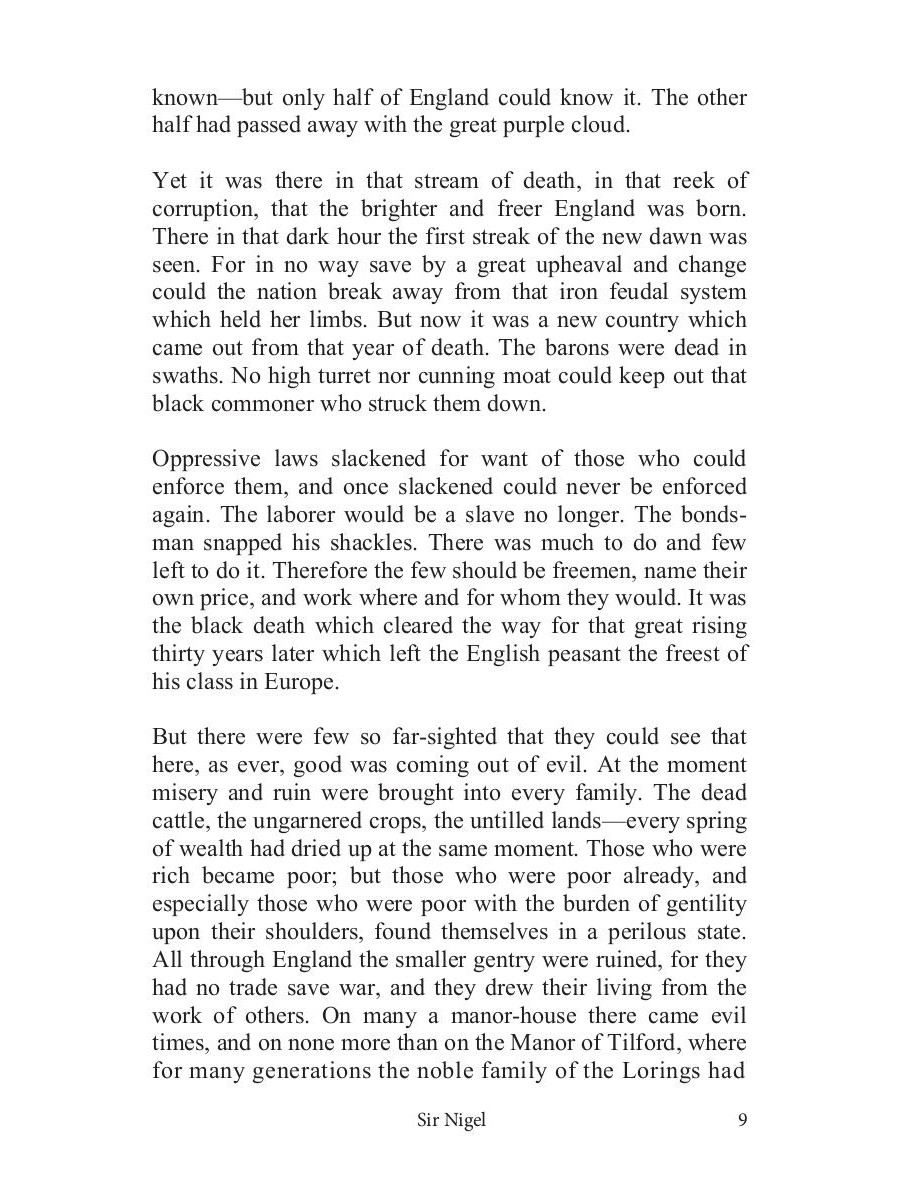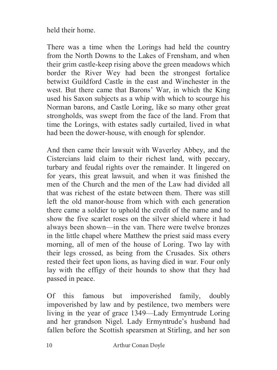 «Сэр Найджел Лоринг» - это исторический роман Дойла, рассказывающий о юности главного героя, проведённой на службе короля Англии. Автор необычайно живо и ярко описал жизнь и быт английских рыцарей и лучников. Читателя ждут невероятные приключения, настоящие герои и закрученный сюжет.