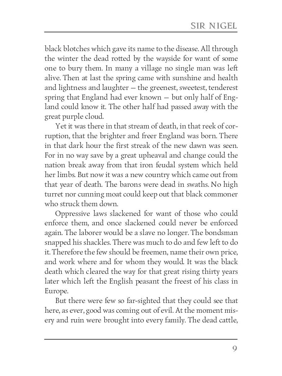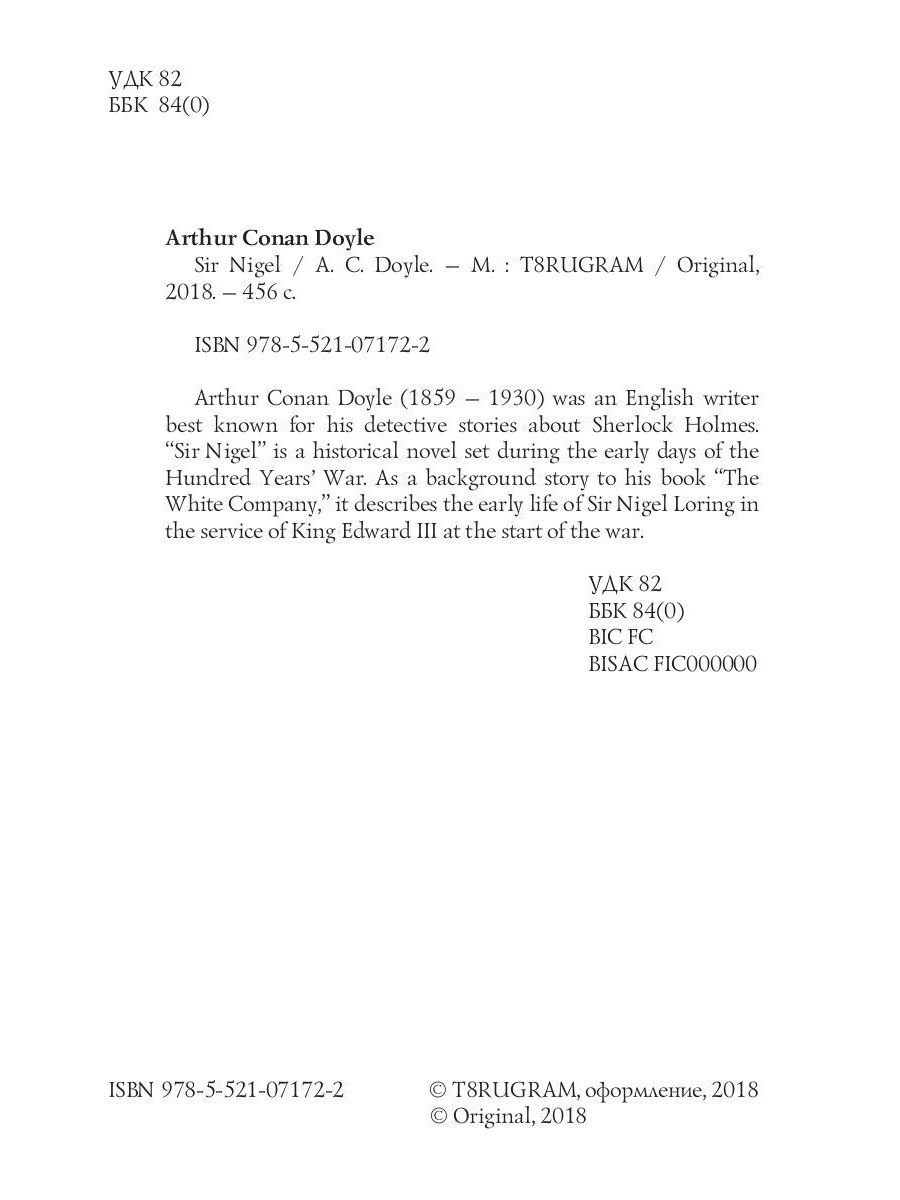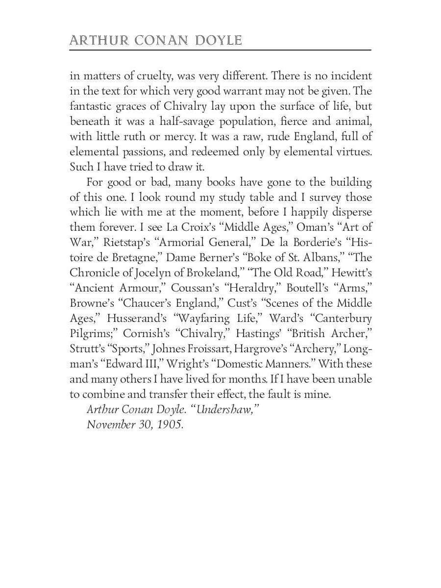 Arthur Conan Doyle (1859-1930) was an English writer best known for his detective stories about Sherlock Holmes. "Sir Nigel" is a historical novel set during the early days of the Hundred Years' War. As a background story to his book "The White Company", it describes the early life of Sir Nigel Loring in the service of King Edward III at the start of the war.
