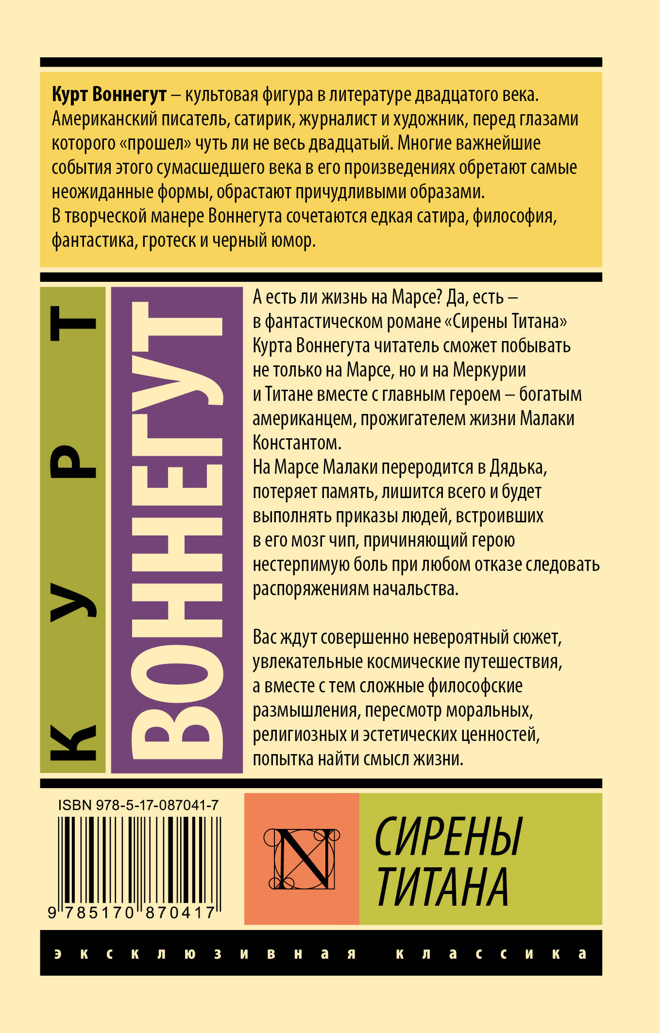 А есть ли жизнь на Марсе? Да, есть - в фантастическом романе "Сирены Титана" Курта Воннегута читатель сможет побывать не только на Марсе, но и на Меркурии и Титане вместе с главным героем - богатым американцем, прожигателем жизни Малаки Константом. На Марсе Малаки переродится в Дядька, потеряет память, лишится всего и будет выполнять приказы людей, встроивших в его мозг чип, причиняющий герою нестерпимую боль при любом отказе следовать распоряжениям начальства. Вас ждет совершенно невероятный сюжет, увлекательные космические путешествия, а вместе с тем сложные философские размышления, пересмотр моральных, религиозных и эстетических ценностей, попытка найти смысл жизни.| Издательство | ИЗДАТЕЛЬСТВО "АСТ" |