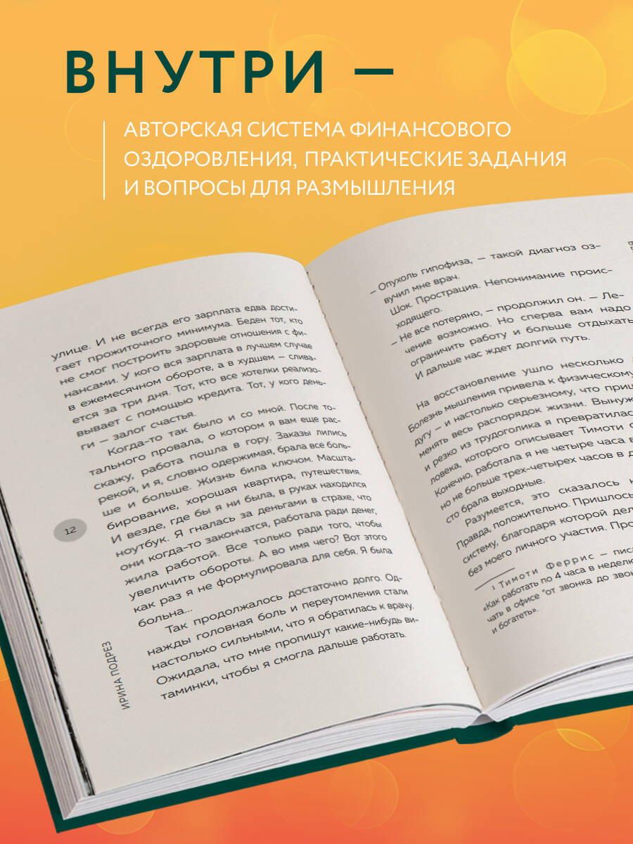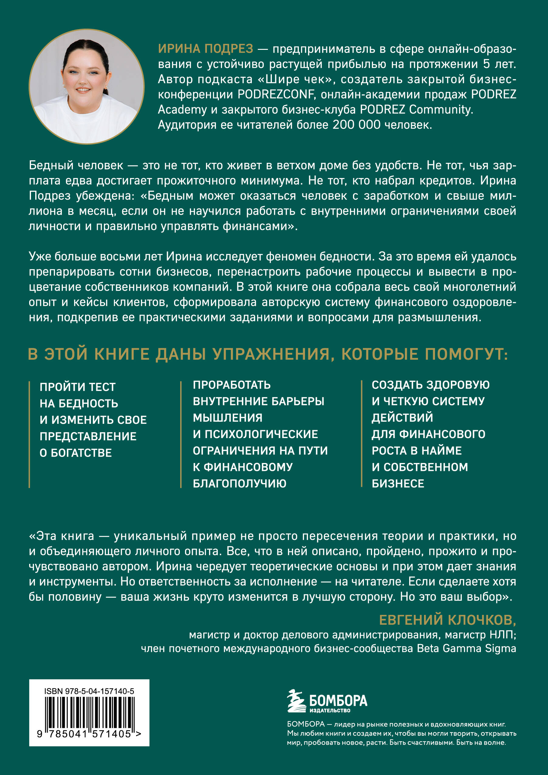 Бедный человек - это не тот, кто живет в ветхом доме без удобств. Не тот, чья зарплата едва достигает прожиточного минимума. Не тот, кто набрал кредитов. Ирина Подрез убеждена: «Бедность - это свойство нашей психики и мышления, а уже потом, как следствие, качество наших материальных результатов, способность их удерживать и преумножать. Бедным может оказаться человек с заработком и свыше миллиона в месяц, если он не научился работать с внутренними ограничениями своей личности и правильно действовать на устойчивый результат и здоровый рост». Уже больше восьми лет Ирина исследует феномен бедности. За это время ей удалось препарировать сотни бизнесов, перенастроить рабочие процессы и вывести в процветание собственников компаний. В этой книге она собрала весь свой многолетний опыт и кейсы клиентов, сформировала авторскую систему финансового оздоровления, подкрепив ее практическими заданиями и вопросами для размышления. ЭТА КНИГА ДАСТ ВАМ УПРАЖНЕНИЯ, КОТОРЫЕ ПОМОГУТ: • пройти тест на бедность и изменить свое представление о богатстве; • проработать внутренние барьеры мышления и психологические ограничения на пути к финансовому благополучию; • повысить уровень дохода в найме и собственном бизнесе; • создать здоровую и четкую систему действий для финансового роста. ОБ АВТОРЕ: Ирина Подрез - предприниматель, эксперт в продажах и маркетинге. В 2015 году окончила университет Телекоммуникаций им. проф. Бонч-Бруевича по специализации «бизнес-информатика». В 2018 году получила магистерскую степень по стратегическому менеджменту. С 2018 года ведет блог про системный рост бизнеса и психологию. Аудитория ее читателей более 200 000 человек. Ирина является автором популярного медиа-проекта «ШИРЕ ЧЕК». Лучший подкаст в категории «Бизнес» 2021 г. В 2022 году основала online-академию «PODREZ.ACADEMY», обучение в которой прошли уже более 10 000 человек. В 2024 году открыла бизнес-клуб «PODREZ Community», который объединяет сильных предпринимателей и дает им возможность быстрого роста и масштабирования. Идейный вдохновитель закрытой бизнес-конференции «PODREZCONF». Эксперт федеральных СМИ и автор публикаций в ТОП-изданиях. ЦИТАТЫ: «Беден тот, кто не смог построить здоровые отношения с финансами». «Финансово здоровые люди говорят о целях, планах, решениях. Они говорят о впечатлениях, событиях, путешествиях. Говорят о хобби, новых увлечениях, обсуждают кино и искусство. Разговоры бедных людей наполнены проблемами. На работе, дома, с друзьями. Кто куда пошел, кто что сделал, кому кто что сказал, кто кому что ответил. Речь бедных людей сильно сконцентрирована на страдании и ощущении безысходности». «Свобода подразумевает, что вы все сделали своими собственными руками, и это ваш личный выбор. И ваши действия привели туда, где вы сейчас есть». «С каждым витком влияние убеждений становится менее интенсивными, и формируется навык справляться с ними быстрее и легче». «Если у вас чего-то нет, значит, вторичные выгоды сильно перевешивают те плюсы, которые вы получаете». ОТЗЫВ: «Эта книга - уникальный пример не просто пересечения теории и практики, но и объединяющего личного опыта. Все, что в ней описано - пройдено, прожито и прочувствовано автором. При этом, несколько раз ловил себя на мысли, что речь идет о моем прошлом, о моих личных ситуациях и моих взаимоотношениях с окружающим миром. Думаю,