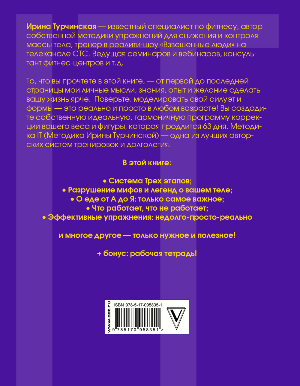 Ирина Турчинская - известный специалист по фитнесу, автор собственной методики упражнений для снижения и контроля массы тела, тренер в реалити-шоу «Взвешенные люди» на телеканале СТС. Ведущая семинаров и вебинаров, консультант фитнес-центров и т.д. То, что вы прочтете в этой книге, - от первой до последней страницы мои личные мысли, знания, опыт и желание сделать вашу жизнь ярче. Поверьте, моделировать свой силуэт и формы - это реально и просто в любом возрасте! Вы создадите собственную идеальную, гармоничную программу коррекции вашего веса и фигуры, которая продлится 63 дня. Методика IT (Методика Ирины Турчинской) - одна из лучших авторских систем тренировок и долголетия.