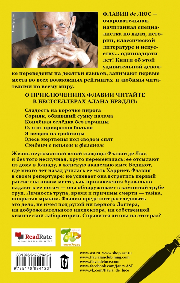 Жизнь неугомонной юной сыщицы Флавии де Люс, и без того нескучная, круто переменилась: ее отсылают из дома в Канаду, в женскую академию мисс Бодикот, где много лет назад училась ее мать Харриет. Флавия в своем репертуаре: не успевает она встретить первый рассвет на новом месте, как приключения буквально падают к ее ногам - она обнаруживает в каминной трубе труп. Личность трупа, время и причины смерти - тайна, покрытая мраком. Флавии предстоит расследовать это дело, не имея под рукой ни верного Доггера, ни доброжелательного инспектора, ни собственной химической лаборатории. Справится ли она на этот раз?