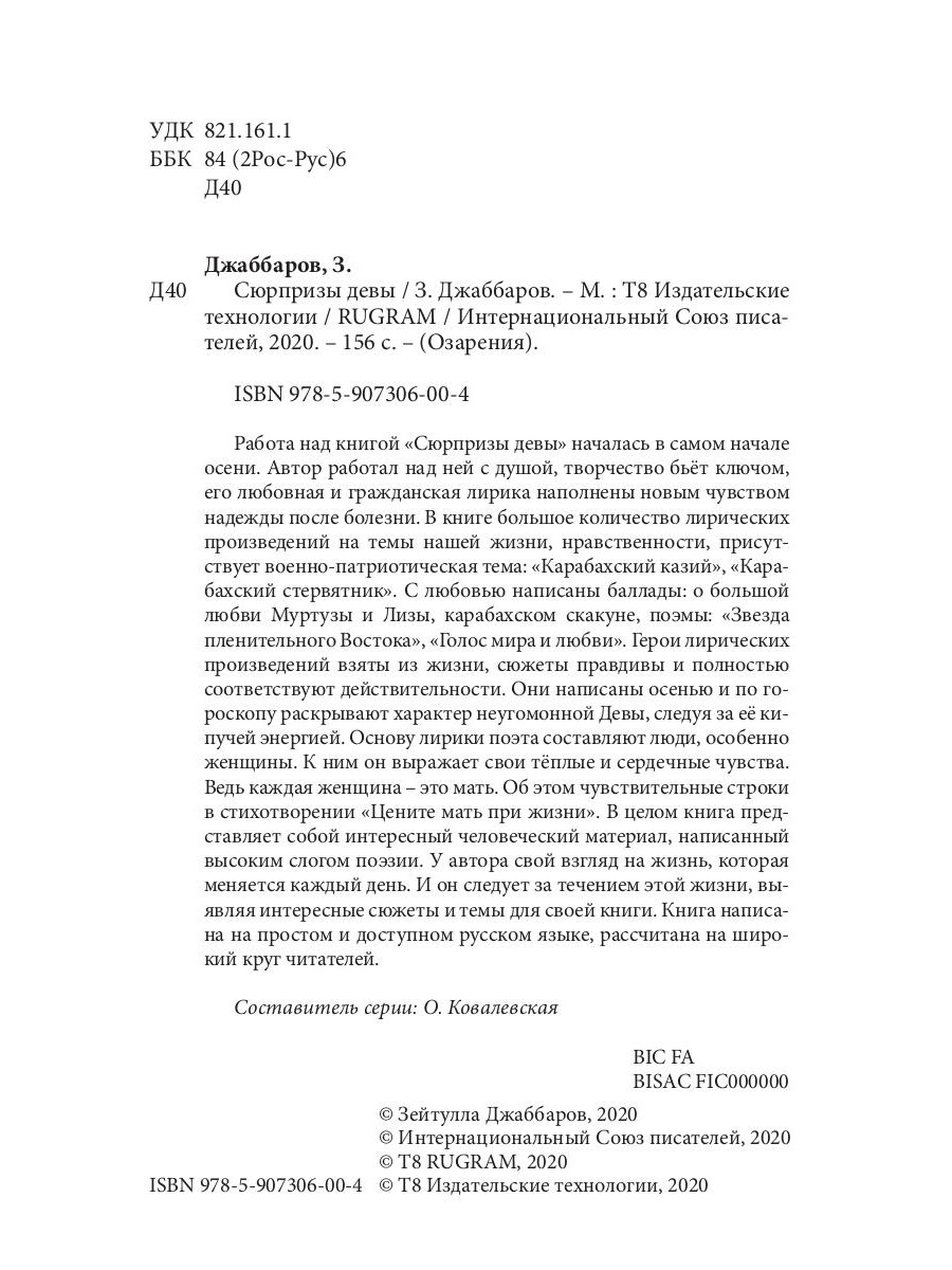 Работа над книгой «Сюрпризы девы» началась в самом начале осени. Автор работал над ней с душой, творчество бьёт ключом, его любовная и гражданская лирика наполнены новым чувством надежды после болезни. В книге большое количество лирических произведений на темы нашей жизни, нравственности, присутствует военно-патриотическая тема: «Карабахский казий», «Карабахский стервятник». С любовью написаны баллады: о большой любви Муртузы и Лизы, карабахском скакуне, поэмы: «Звезда пленительного Востока», «Голос мира и любви». Герои лирических произведений взяты из жизни, сюжеты правдивы и полностью соответствуют действительности. Они написаны осенью и по гороскопу раскрывают характер неугомонной Девы, следуя за её кипучей энергией. Основу лирики поэта составляют люди, особенно женщины. К ним он выражает свои тёплые и сердечные чувства. Ведь каждая женщина - это мать. Об этом чувствительные строки в стихотворении «Цените мать при жизни». В целом книга представляет собой интересный человеческий материал, написанный высоким слогом поэзии. У автора свой взгляд на жизнь, которая меняется каждый день. И он следует за течением этой жизни, выявляя интересные сюжеты и темы для своей книги. Книга написана на простом и доступном русском языке, рассчитана на широкий круг читателей.| Издательство | Т8 RUGRAM |
