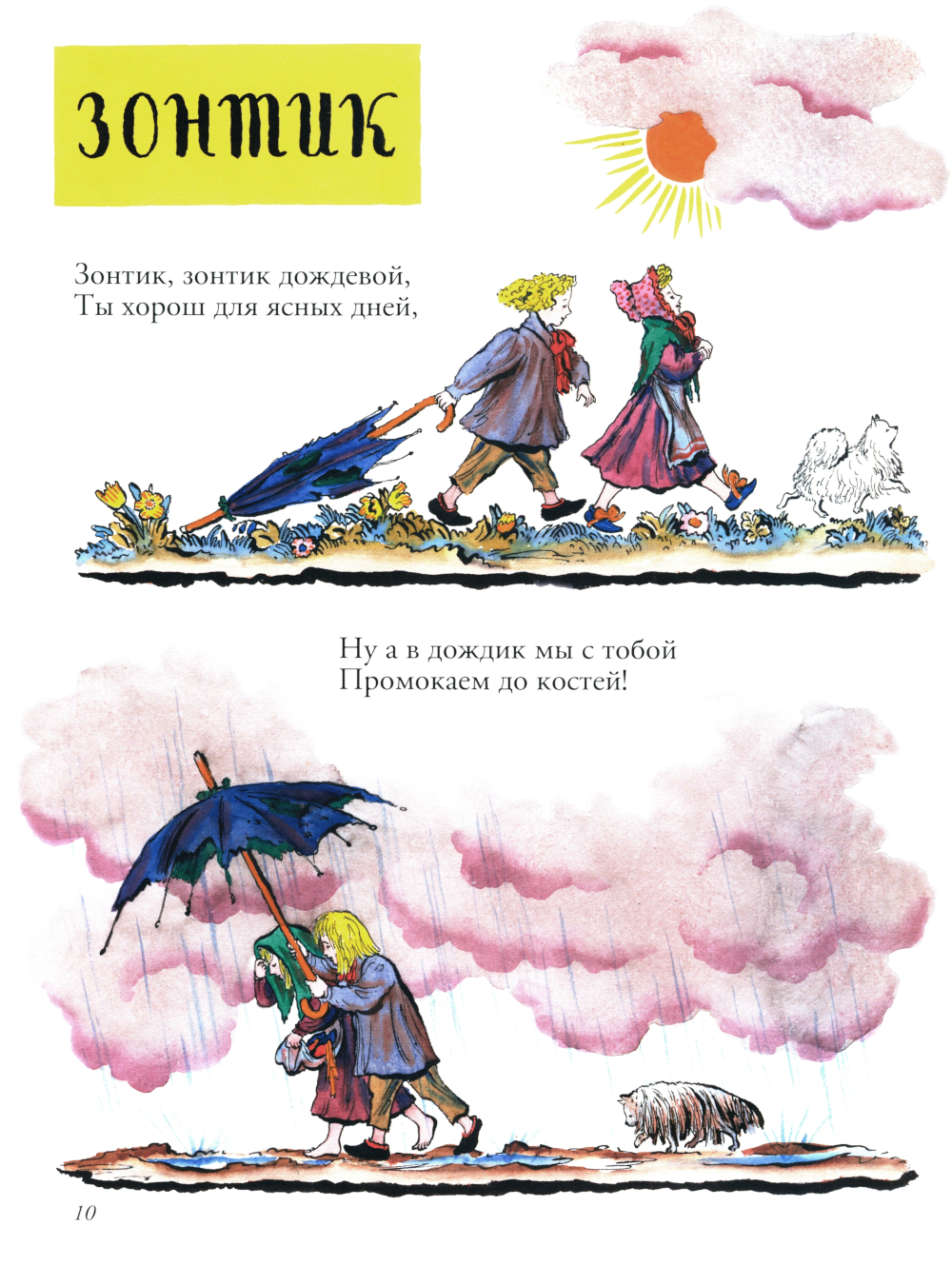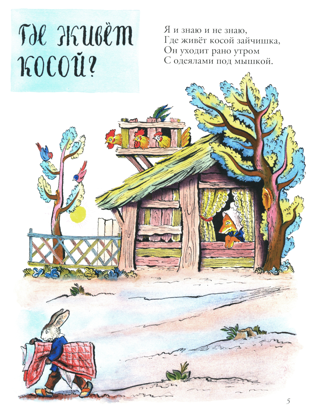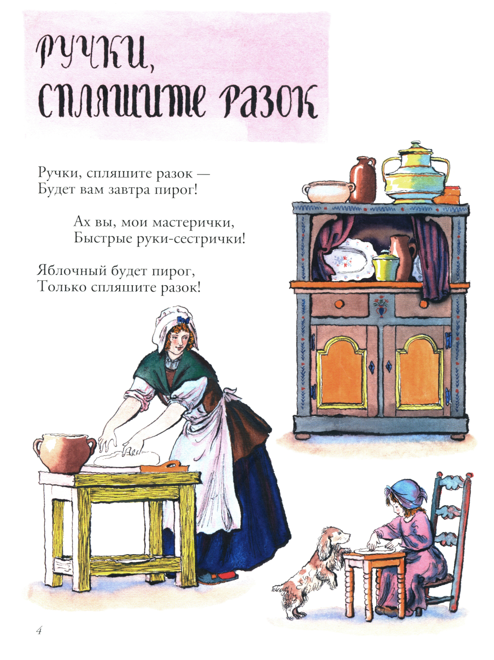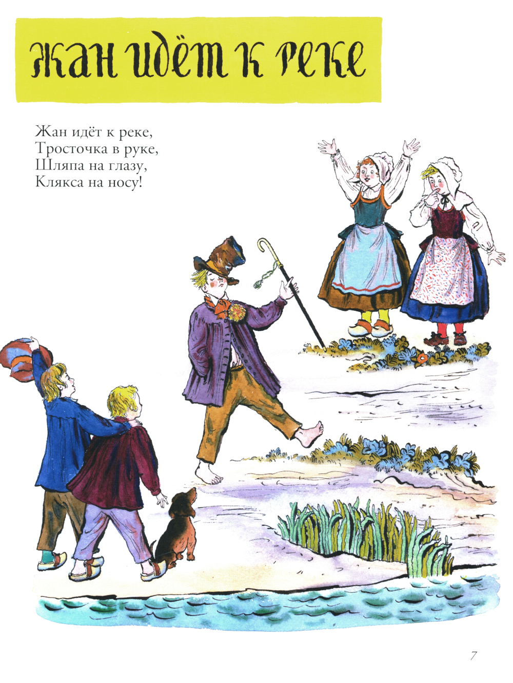 Звучные, чистые, легко запоминающиеся короткие стишки в прекрасном переводе Нины Гернет и Сергея Гиппиуса сохранили мягкую игровую интонацию и поистине французские галантность, кокетство и добрую насмешку. Книгу хочется не только перечитывать, но и, благодаря замечательным иллюстрациям Владимира Конашевича, неоднократно рассматривать. Персонажи и предметы всегда показаны полностью, чтобы, как говорил сам художник, «все его части были видны». Костюмы, утварь, дома, сами герои сохраняют национальный колорит. Конашевич рисует не просто картинки. Он развивает и дорисовывает текст, окружает маленькое стихотворение такой массой красноречивых" всамделишных" подробностей, что описание их заняло бы целую страницу. Например, в стихотворении «Юбочка» вместе с нарядной барышней лихо танцует кошечка с бантом, уморительно повторяющая движения хозяйки: барышня придерживает рукой подол юбочки, а кошка придерживает лапкой свой длинный хвост. А к четверостишью «Где живет косой» - о зайчике, который каждое утро куда-то уходит с одеялом под мышкой, - художник создает подробную рисованную историю с хитрой лисой, подглядывающей из окошка за длинноухим, деловито шагающим мимо. На крыше у лисы, между прочим, собственный курятник, и переполошенные куры во главе с петухом кудахчут-судачат, куда же направился зайчик. Книга рекомендуется для дотошного рассматривания картинок и чтения взрослыми детям младшего дошкольного возраста.| Издательство | Мелик-Пашаев |