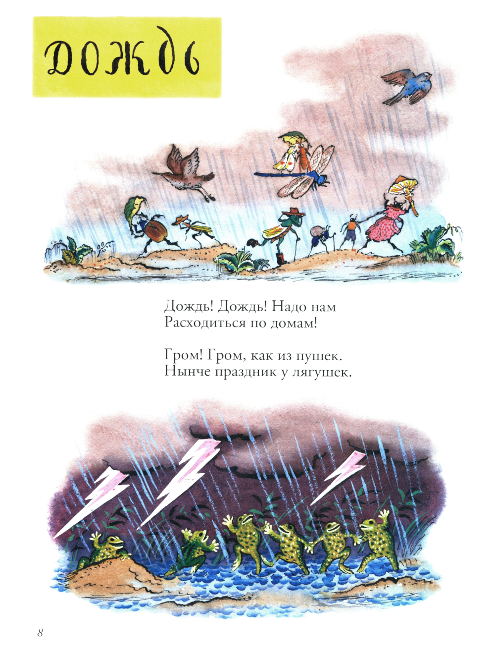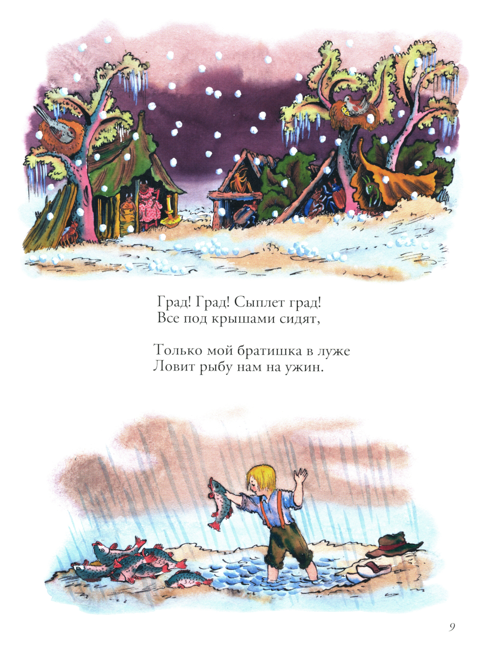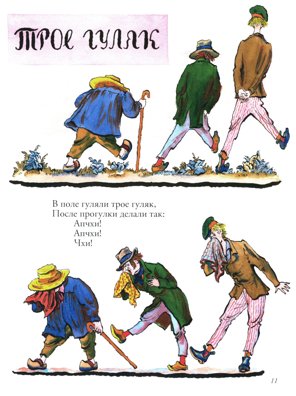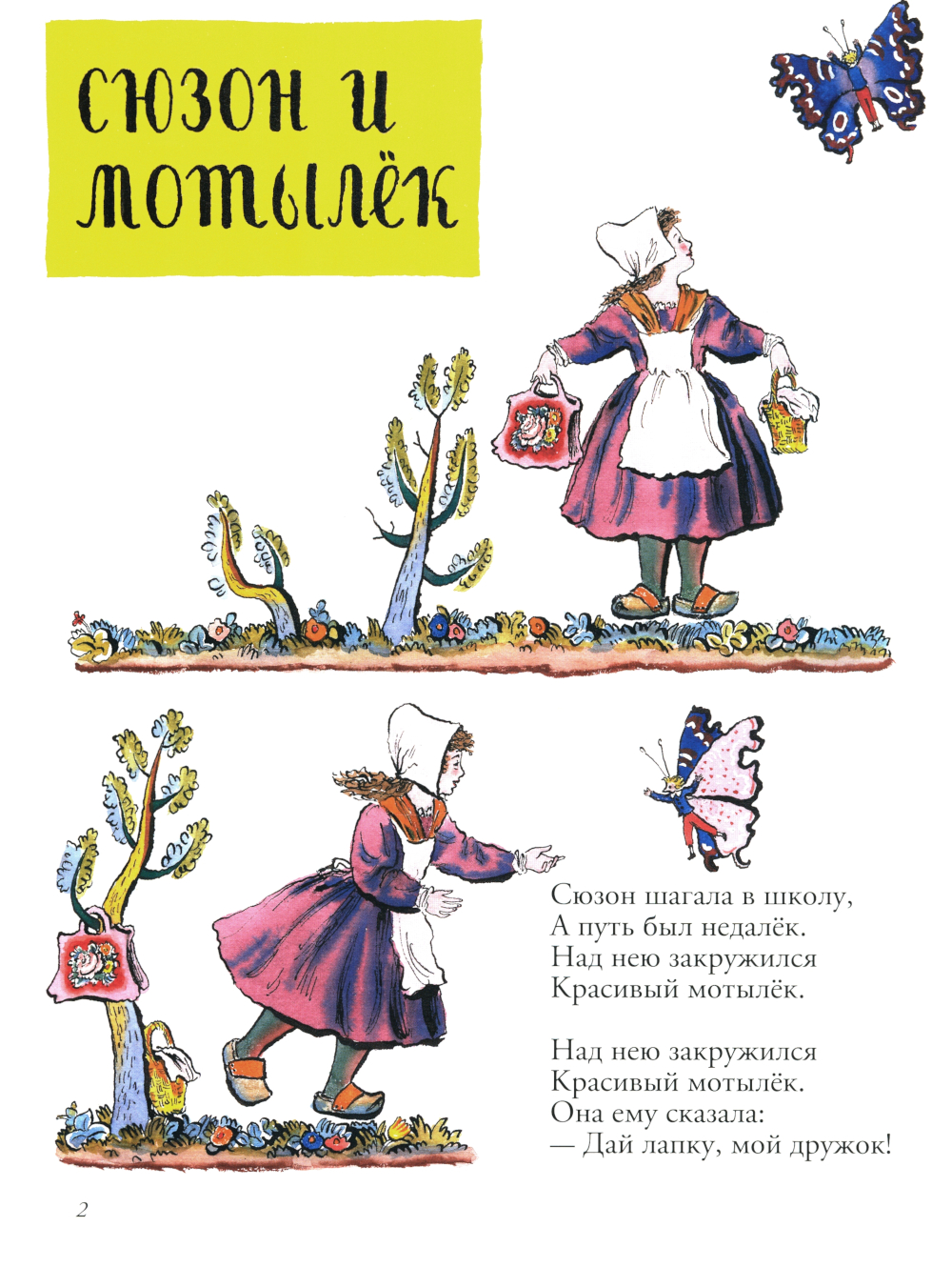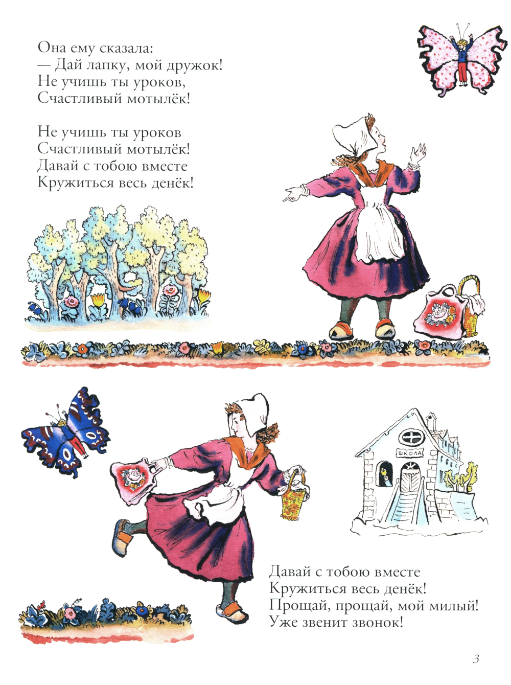 Звучные, чистые, легко запоминающиеся короткие стишки в прекрасном переводе Нины Гернет и Сергея Гиппиуса сохранили мягкую игровую интонацию и поистине французские галантность, кокетство и добрую насмешку. Книгу хочется не только перечитывать, но и, благодаря замечательным иллюстрациям Владимира Конашевича, неоднократно рассматривать. Персонажи и предметы всегда показаны полностью, чтобы, как говорил сам художник, «все его части были видны». Костюмы, утварь, дома, сами герои сохраняют национальный колорит. Конашевич рисует не просто картинки. Он развивает и дорисовывает текст, окружает маленькое стихотворение такой массой красноречивых" всамделишных" подробностей, что описание их заняло бы целую страницу. Например, в стихотворении «Юбочка» вместе с нарядной барышней лихо танцует кошечка с бантом, уморительно повторяющая движения хозяйки: барышня придерживает рукой подол юбочки, а кошка придерживает лапкой свой длинный хвост. А к четверостишью «Где живет косой» - о зайчике, который каждое утро куда-то уходит с одеялом под мышкой, - художник создает подробную рисованную историю с хитрой лисой, подглядывающей из окошка за длинноухим, деловито шагающим мимо. На крыше у лисы, между прочим, собственный курятник, и переполошенные куры во главе с петухом кудахчут-судачат, куда же направился зайчик. Книга рекомендуется для дотошного рассматривания картинок и чтения взрослыми детям младшего дошкольного возраста.| Издательство | Мелик-Пашаев |