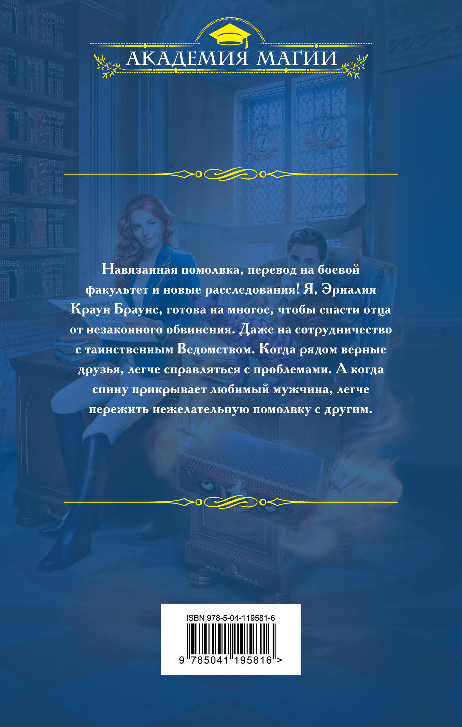 Навязанная помолвка, перевод на боевой факультет и новые расследования! Я, Эрналия Краун Браунс, готова на многое, чтобы спасти отца от незаконного обвинения. Даже на сотрудничество с таинственным Ведомством. Когда рядом верные друзья, легче справляться с проблемами. А когда спину прикрывает любимый мужчина, легче пережить нежелательную помолвку с другим.| Издательство | ООО "Издательство "Эксмо" |