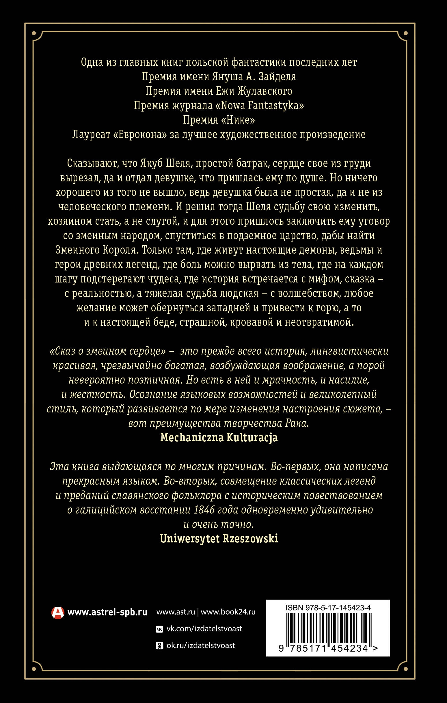 Сказывают, что Якуб Шеля, простой батрак, сердце свое из груди вырезал, да и отдал девушке, что пришлась ему по душе. Но ничего хорошего из того не вышло, ведь девушка была не простая, да и не из человеческого племени. И решил тогда Шеля судьбу свою изменить, хозяином стать, а не слугой, и для этого пришлось заключить ему уговор со змеиным народом, спуститься в подземное царство, дабы найти Змеиного Короля. Только там, где живут настоящие демоны, ведьмы и герои древних легенд, где боль можно вырвать из тела, где на каждом шагу подстерегают чудеса, где история встречается с мифом, сказка - с реальностью, а тяжелая судьба людская - с волшебством, любое желание может обернуться западней и привести к горю, а то и к настоящей беде, страшной, кровавой и неотвратимой.| Издательство | Издательство "АСТ" |