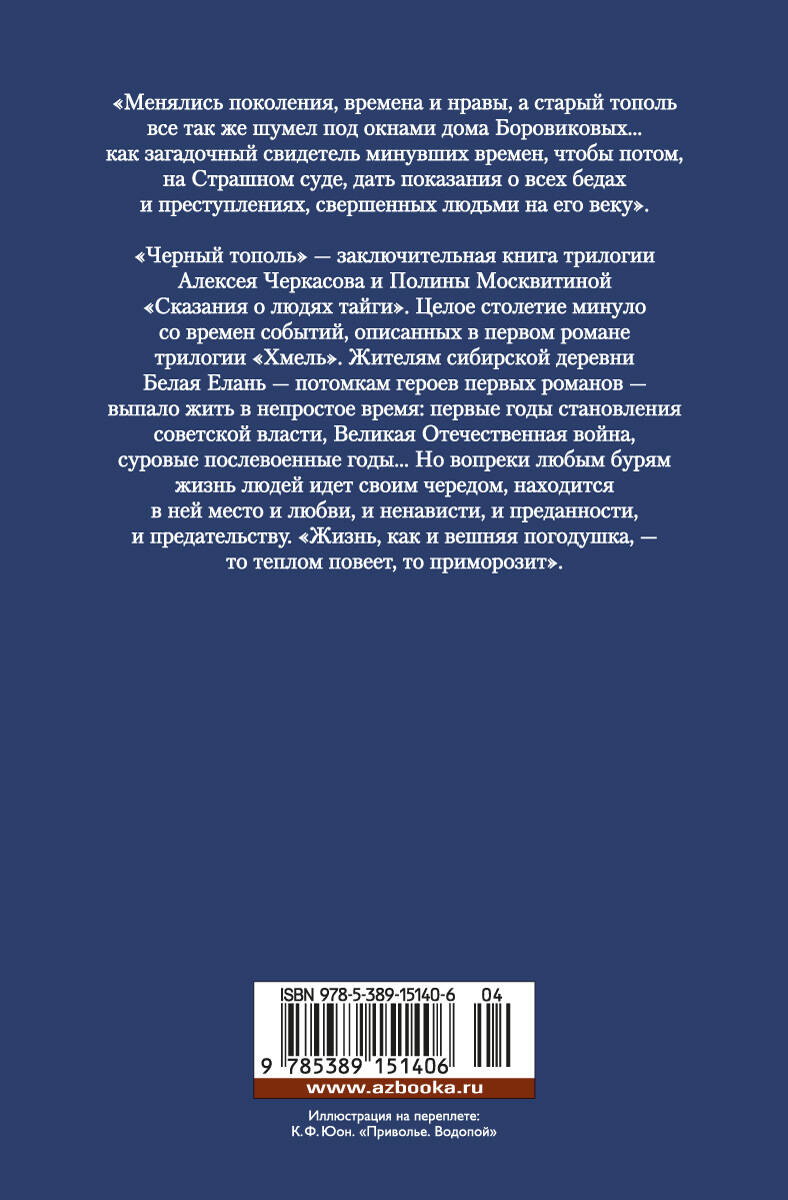 "Черный тополь" - заключительная книга трилогии Алексея Черкасова и Полины Москвитиной "Сказания о людях тайги". Целое столетие минуло со времен событий, описанных в первом романе трилогии "Хмель". Жителям сибирской деревни Белая Елань - потомкам героев первых романов - выпало жить в непростое время: первые годы становления советской власти, Великая Отечественная война, суровые послевоенные годы... Но вопреки любым бурям, жизнь людей идет своим чередом, находится в ней место и любви, и ненависти, и преданности, и предательству. "Жизнь, как и вешняя погодушка, - то теплом повеет, то приморозит".| Издательство | Азбука-Аттикус Издат.группа ООО |
