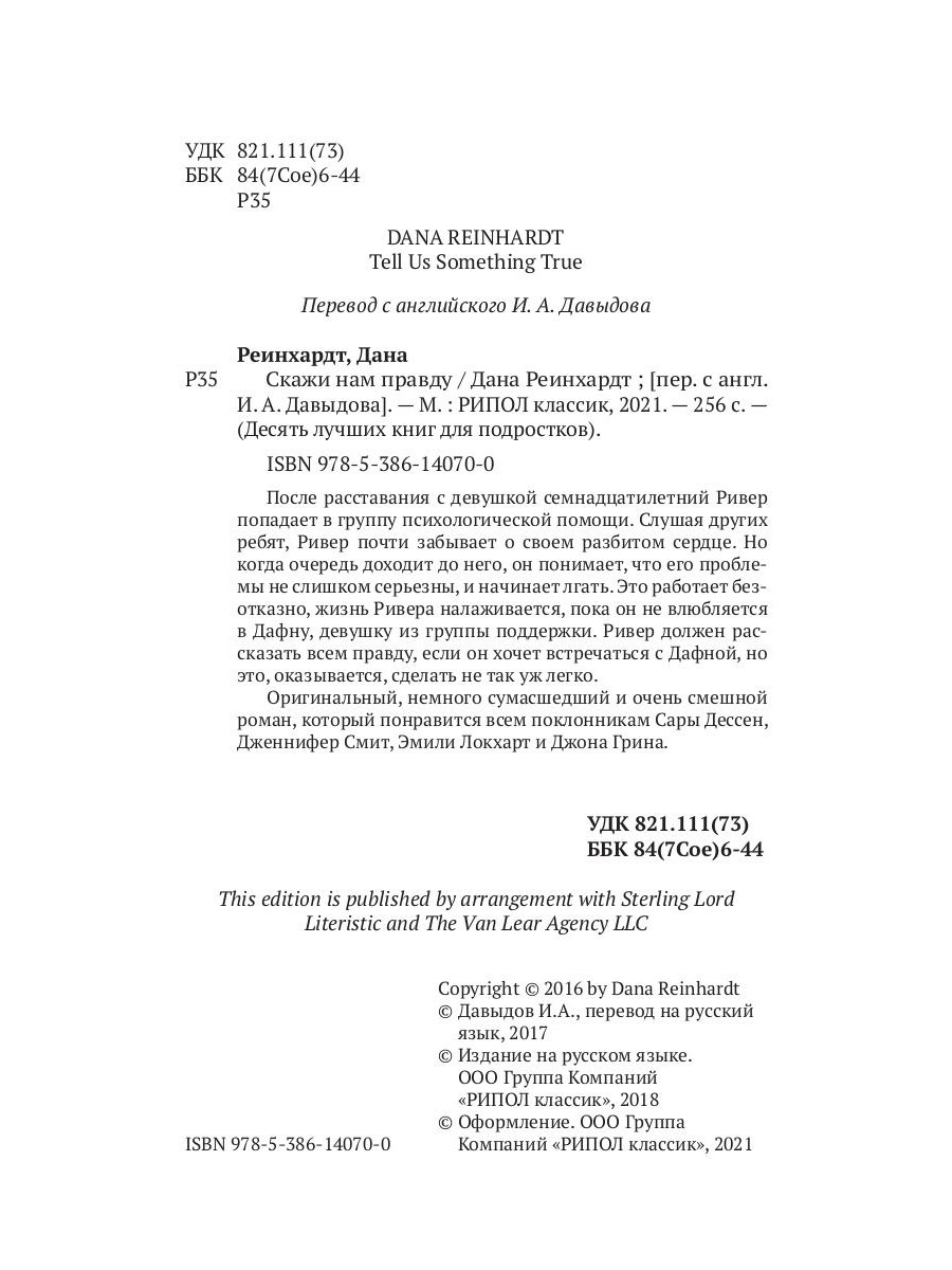 Невероятная история о семнадцатилетнем парне по имени Ривер Дин. После того, как его бросила девушка, он попадает в группу психологической помощи, где ребята рассказывают о своих проблемах. Кто-то страдает булимией, какая-то девушка ворует в магазинах, у одного мальчишки зависимость от видеоигр. Слушая этих ребят, Ривер почти забывает о своем разбитом сердце. Но когда очередь доходит до него, он понимает, что его проблемы не настолько серьезны, и начинает лгать. Это работает безотказно, жизнь Ривера налаживается, пока он не влюбляется в Дафну, девушку из группы поддержки. Ривер должен рассказать всем правду, если он хочет встречаться с Дафной, но это, оказывается, сделать не так уж легко. Оригинальный, немного сумасшедший и очень смешной роман, который понравится всем поклонникам Сары Дессен, Дженнифер Смит, Эмили Локхарт и Джона Грина.| Издательство | Рипол Классик |