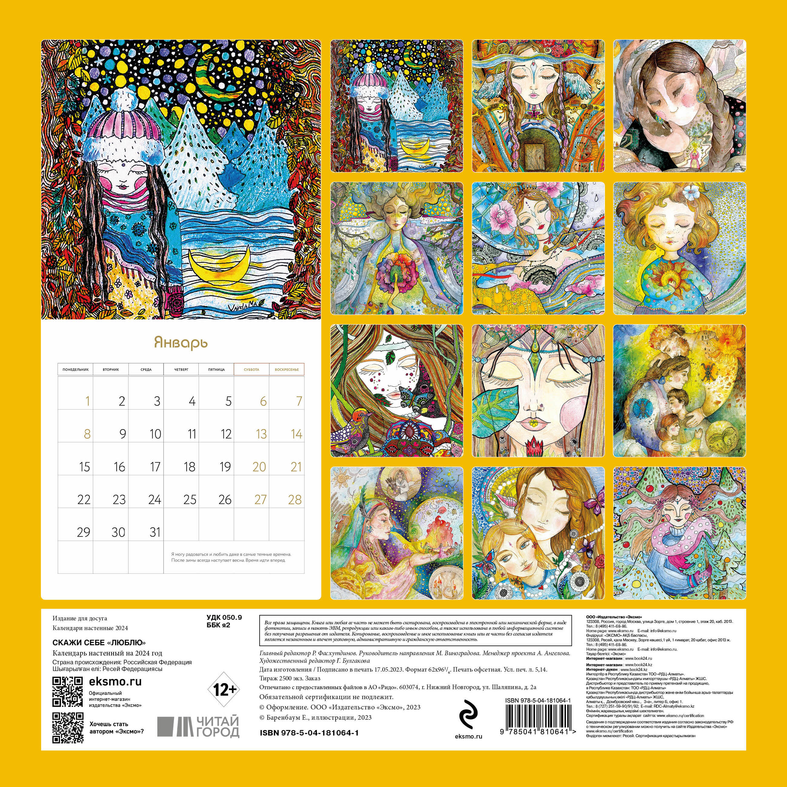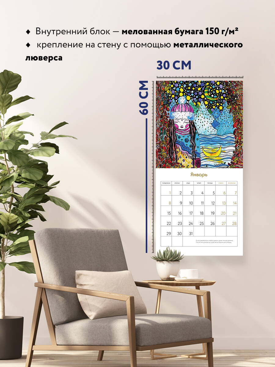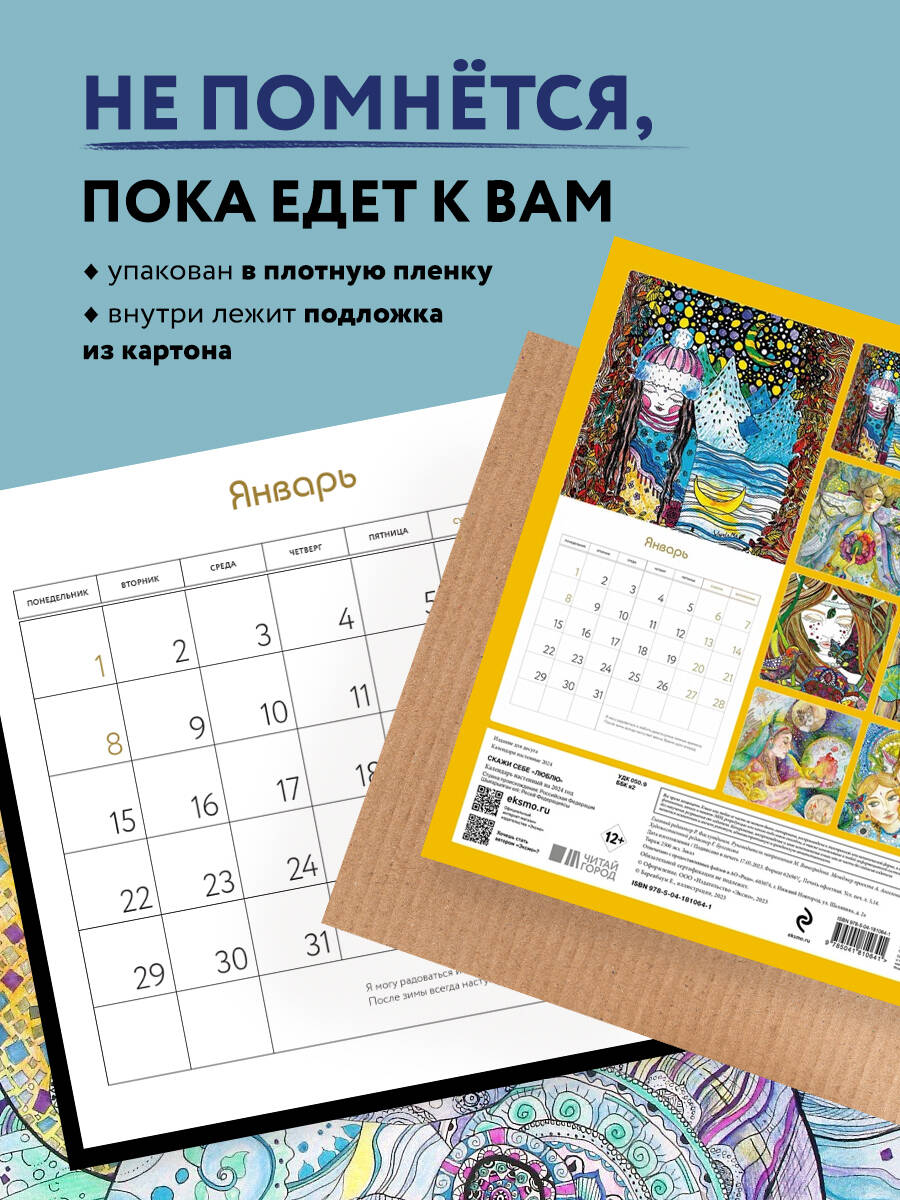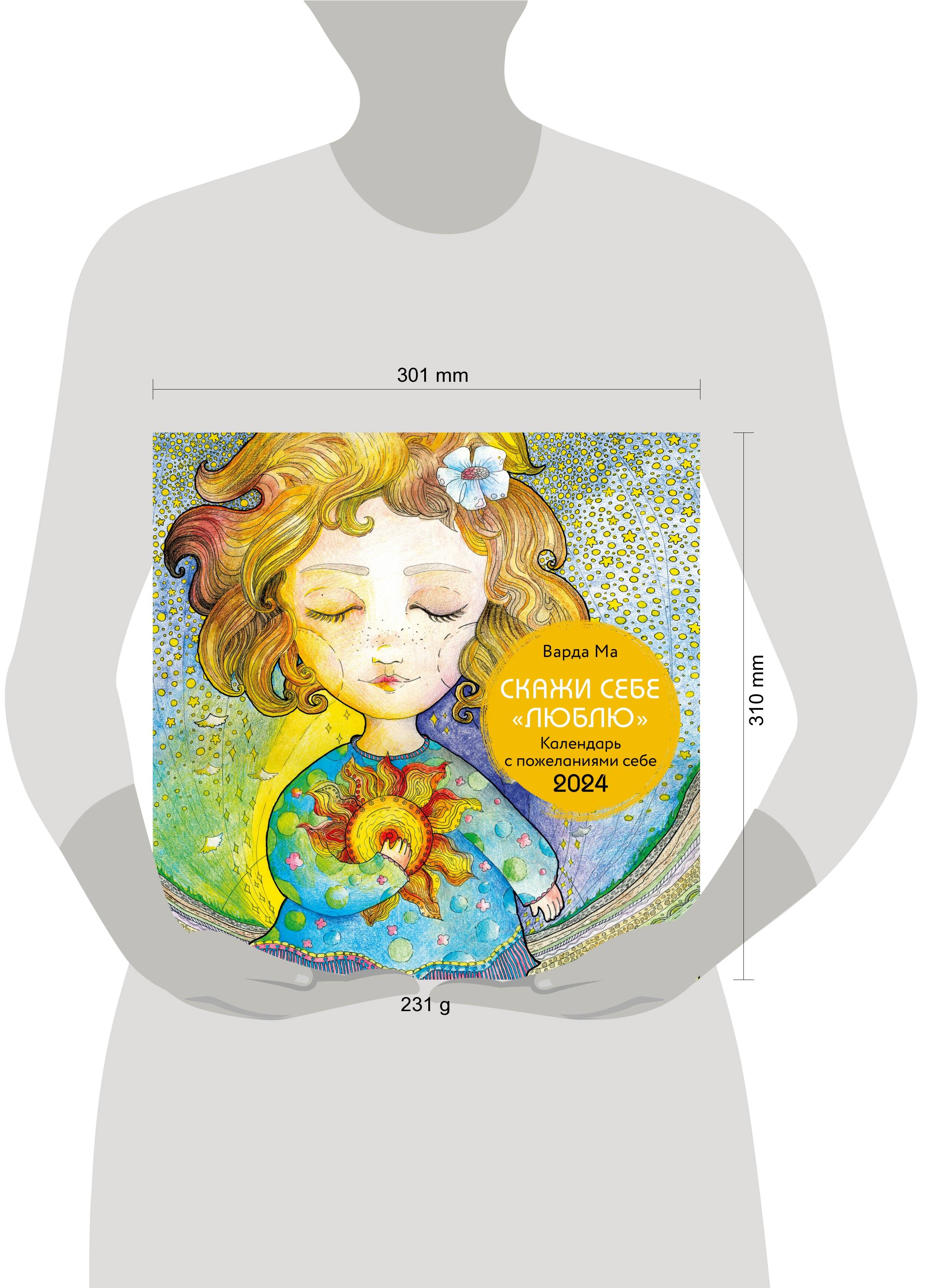 О серии: Наши настенные календари отличаются высоким качеством исполнения! Тщательно подобранные иллюстрации, напечатанные на глянцевой бумаге высочайшего качества, станут настоящим украшением дома, а в календарной сетке найдется место для ваших планов: большие клетки позволят делать записи и организовать свой год! В календаре также отмечены все государственные праздники. В серии настенных календарей издательства «ЭКСМО» каждый найдет тему по вкусу: великие художники, великолепные подборки с самыми знаменитыми произведениями искусства, легендарные кинематографические саги и игры, главные книжные авторы и бестселлеры, фотографии и иллюстрации любимых животных и многое-многое другое! О календаре: Авторский календарь художницы Варды Ма с пожеланиями и аффирмациями к главному человеку в жизни - к себе. Для кого: Для тех, кто учится признаваться себе в чувствах. И тех, кому нужно получить поддержку от себя. Технические параметры: - Тип календаря - настенный перекидной. - Год - 2024. - Календарная сетка - с разбивкой по месяцам. - Вид скрепления - скрепка. - Ширина - 30 см. - Высота - 30 см. - Внутренний блок - мелованная бумага 150 г/м2. - Подложка - плотный гофрокартон для поддержания формы. - Индивидуальная упаковка в плотный целлофановый пакет.| Издательство | ООО "Издательство "Эксмо" |
