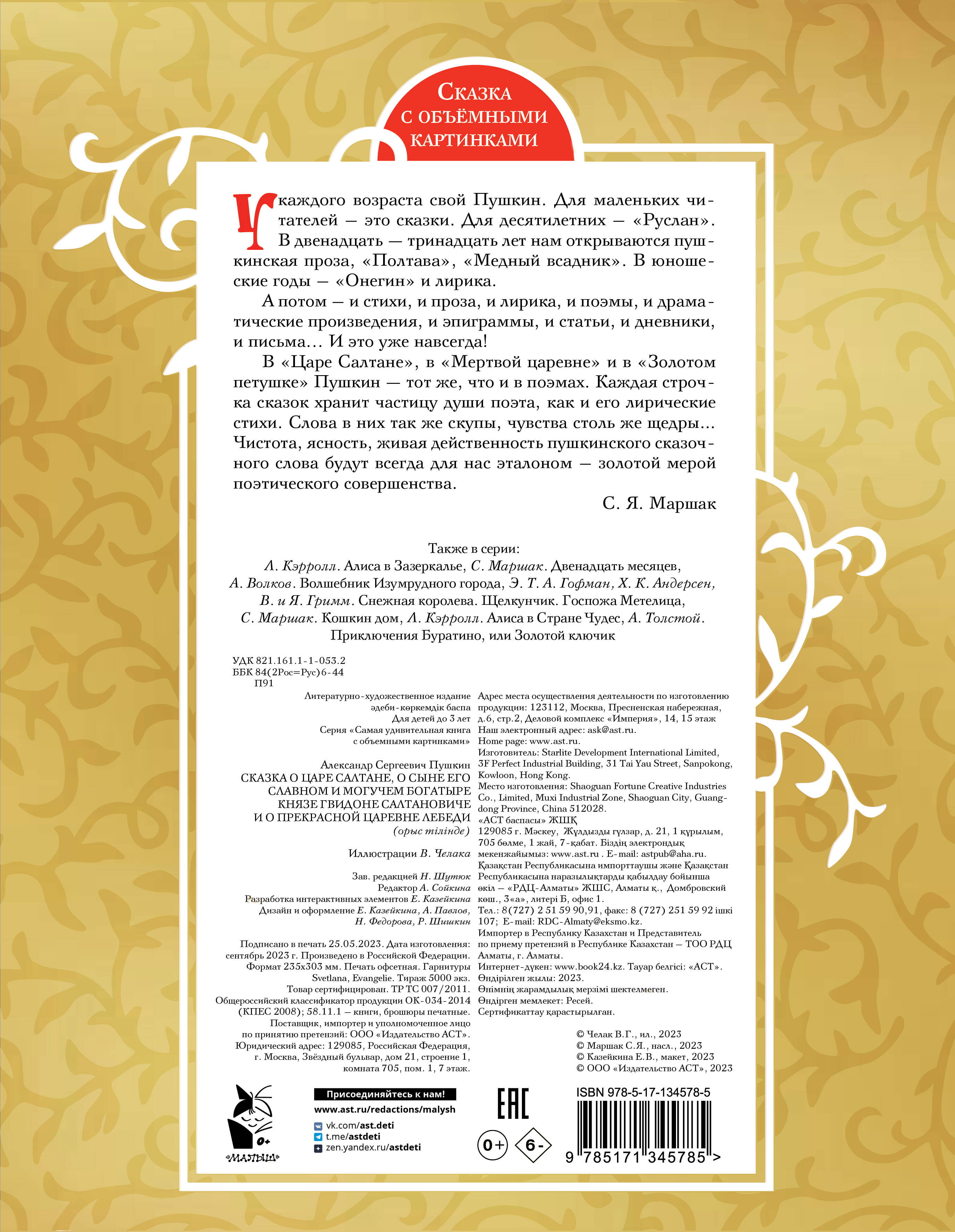 Продолжение легендарной серии "Самая удивительная книга с объемными картинками"! "Сказка о царе Салтане…" А. С. Пушкина - одно из великих произведений русской литературы. Знакомая с детства, с каждым следующим прочтением она раскрывает перед читателем новые грани, более яркие и глубокие. Перед вами не просто книга, а целое путешествие в сказку. Здесь, в нежных акварельных иллюстрациях Вадима Челака и фантастических бумажных конструкциях Екатерины Казейкиной, словно оживают остров Буян со всеми его чудесами, царь Салтан, князь Гвидон и прекрасная Царевна-лебедь. Каждый разворот книги сопровождается объемными элементами, которые погружают читателя в атмосферу волшебного мира русской сказки. Скорее открывайте книгу - чудеса ждут!| Издательство | Издательство "АСТ" |