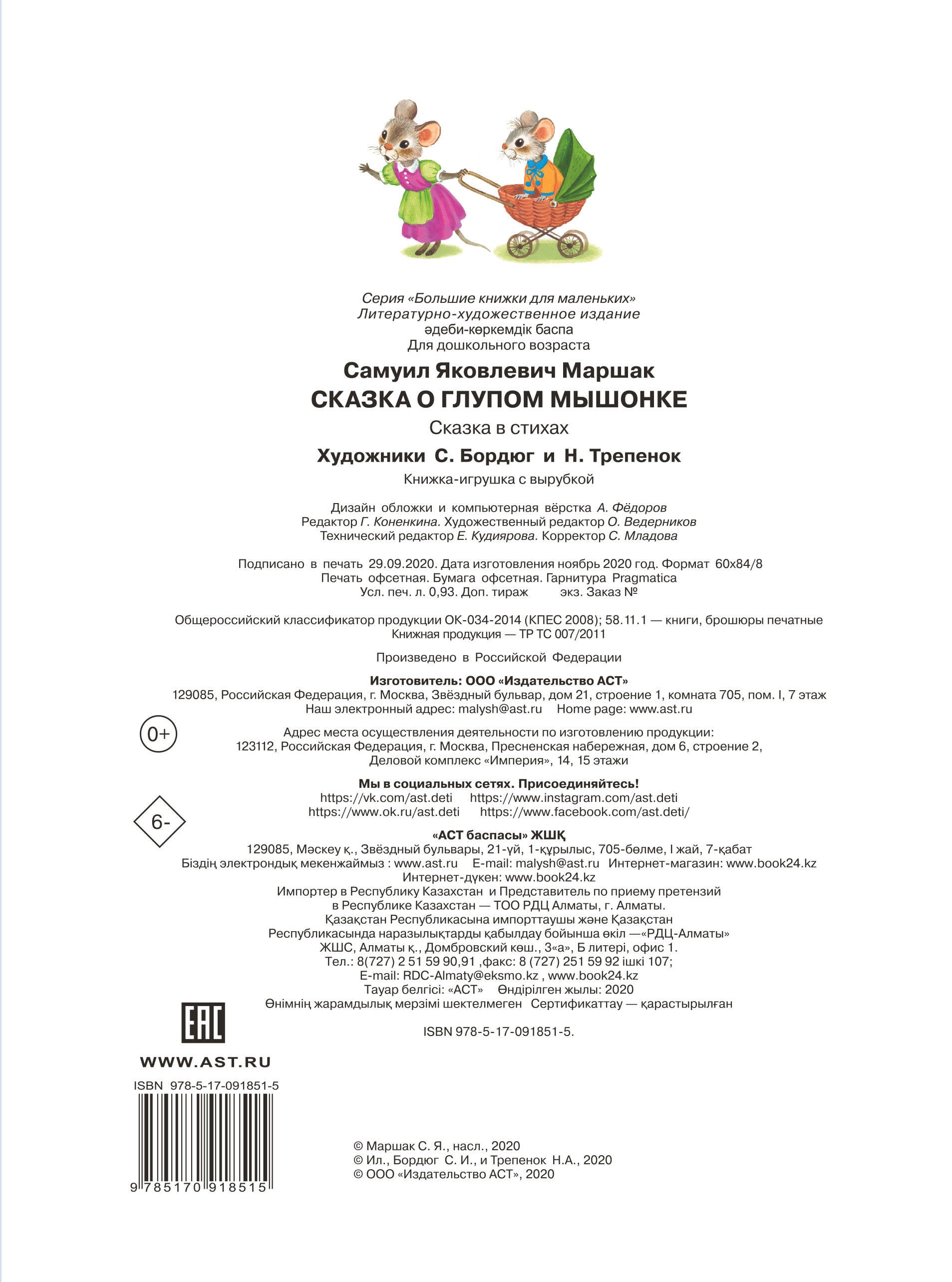 Замечательный детский поэт, классик детской литературы С. Маршак написал чудесную сказку про глупого мышонка много-много лет назад, но детям до сих пор читают её и дети быстро её запоминают наизусть. "Сказка о глупом мышонке" давно и прочно вошла в круг детского чтения. Книжка с большими картинками и большими буквами. Иллюстрации известных художников С. Бордюга и Н. Трепенок. Для дошкольного возраста.| Издательство | Издательство "АСТ" |