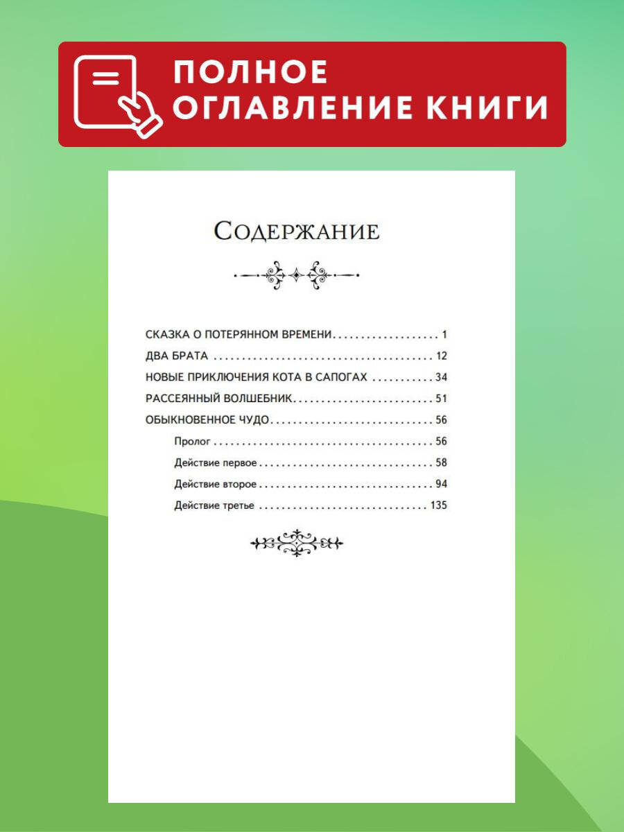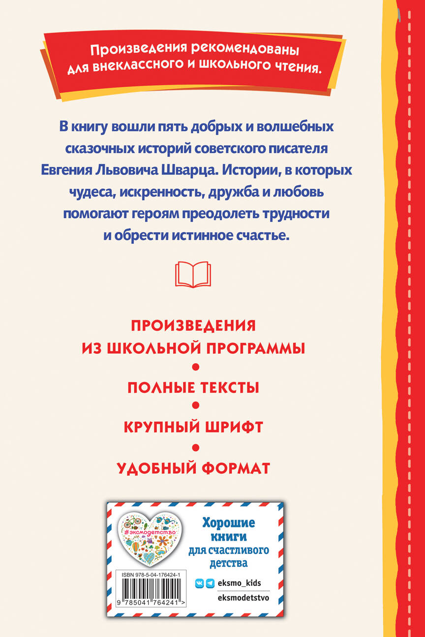 Евгений Шварц - знаменитый писатель-сказочник, драматург и сценарист. В его произведениях сочетаются захватывающий сюжет и понятная ребёнку мораль. Герои Шварца проходят через непростые испытания, учатся быть смелыми, сообразительными и находчивыми, а главное - в этих историях всегда побеждают добро, дружба и любовь. В сборник вошли «Сказка о потерянном времени», «Два брата», «Новые приключения Кота в сапогах», «Рассеянный волшебник» и «Обыкновенное чудо». Серия «Книги для внеклассного чтения» - это подборка главных произведений русских и зарубежных авторов, входящих в школьную программу. Лучшие произведения детской литературы с цветными иллюстрациями помогут привить ребёнку любовь к чтению.| Издательство | ООО "Издательство "Эксмо" |