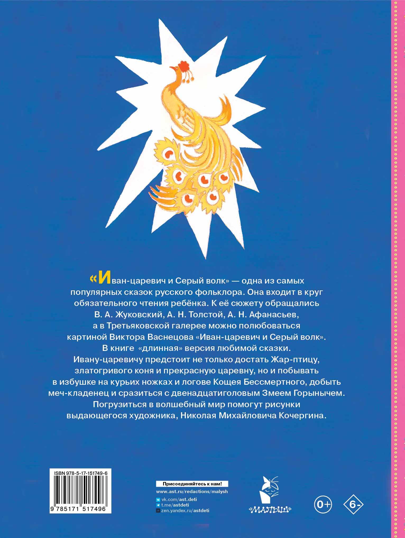 «Сказка об Иване-царевиче и Сером волке» - одна из самых популярных в русском фольклоре. К её сюжету обращались В. А. Жуковский, А. Н. Толстой, А. Н. Афанасьев, а в Третьяковской галерее можно полюбоваться картиной Виктора Васнецова «Иван-царевич и Серый волк». Сказка входит в круг обязательного чтения ребёнка. В книге «длинная» версия любимой сказки. Ивану-царевичу предстоит не только достать Жар-птицу, златогривого коня и прекрасную царевну, но и побывать в избушке на курьих ножках и логове Кощея Бессмертного, добыть меч-кладенец и сразиться с двенадцатиголовым Змеем Горынычем. Погрузиться в волшебный мир помогут рисунки выдающегося художника, представителя «золотого века» детской иллюстрации Николая Михайловича Кочергина.| Издательство | ИЗДАТЕЛЬСТВО "АСТ" |
