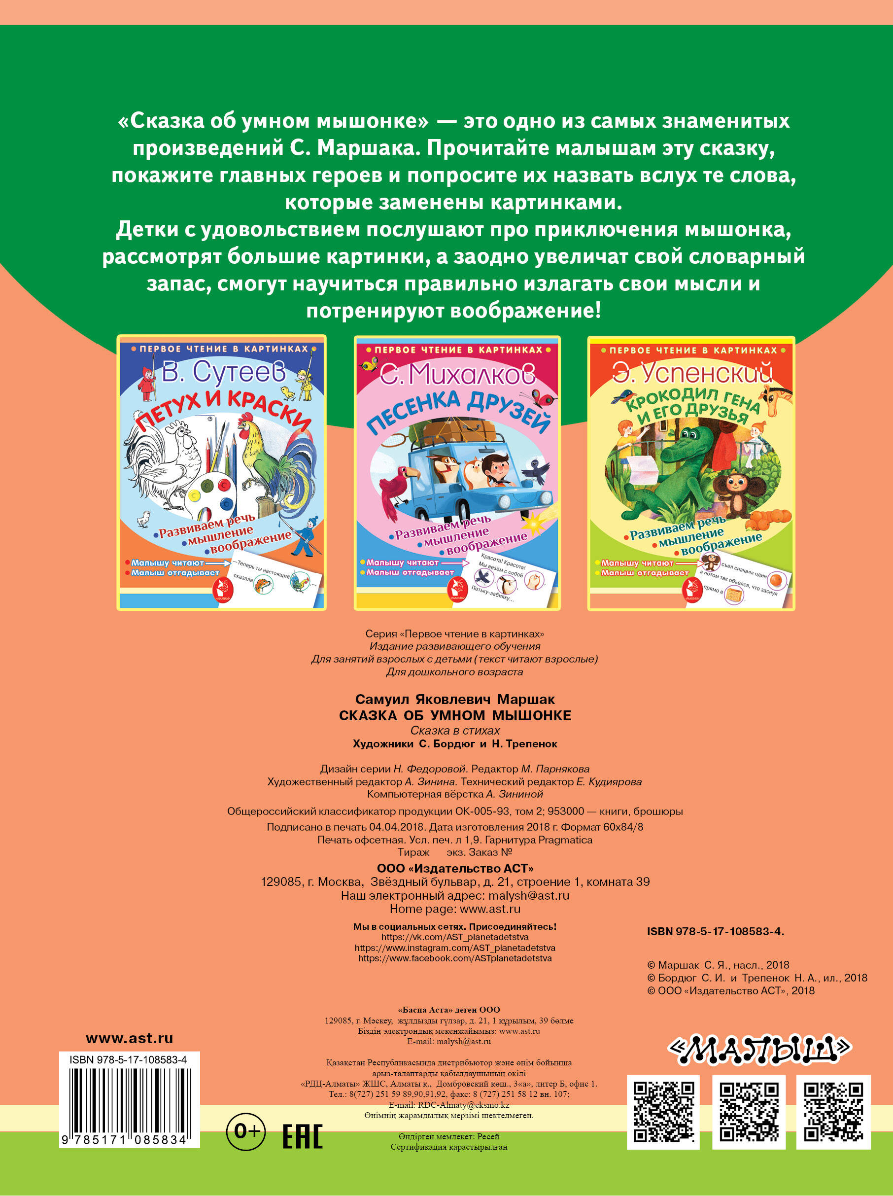 «Первое чтение в картинках» - это новая серия «Малыша», которая поможет родителям приучить маленьких мальчиков и девочек к чтению. Родители читают малышу произведения классиков детской литературы, где некоторые слова заменены картинками, а малыш называет сам это слово вслух. Эта увлекательная игра увеличивает словарный запас, развивает речь, мышление и воображение.| Издательство | ИЗДАТЕЛЬСТВО "АСТ" |