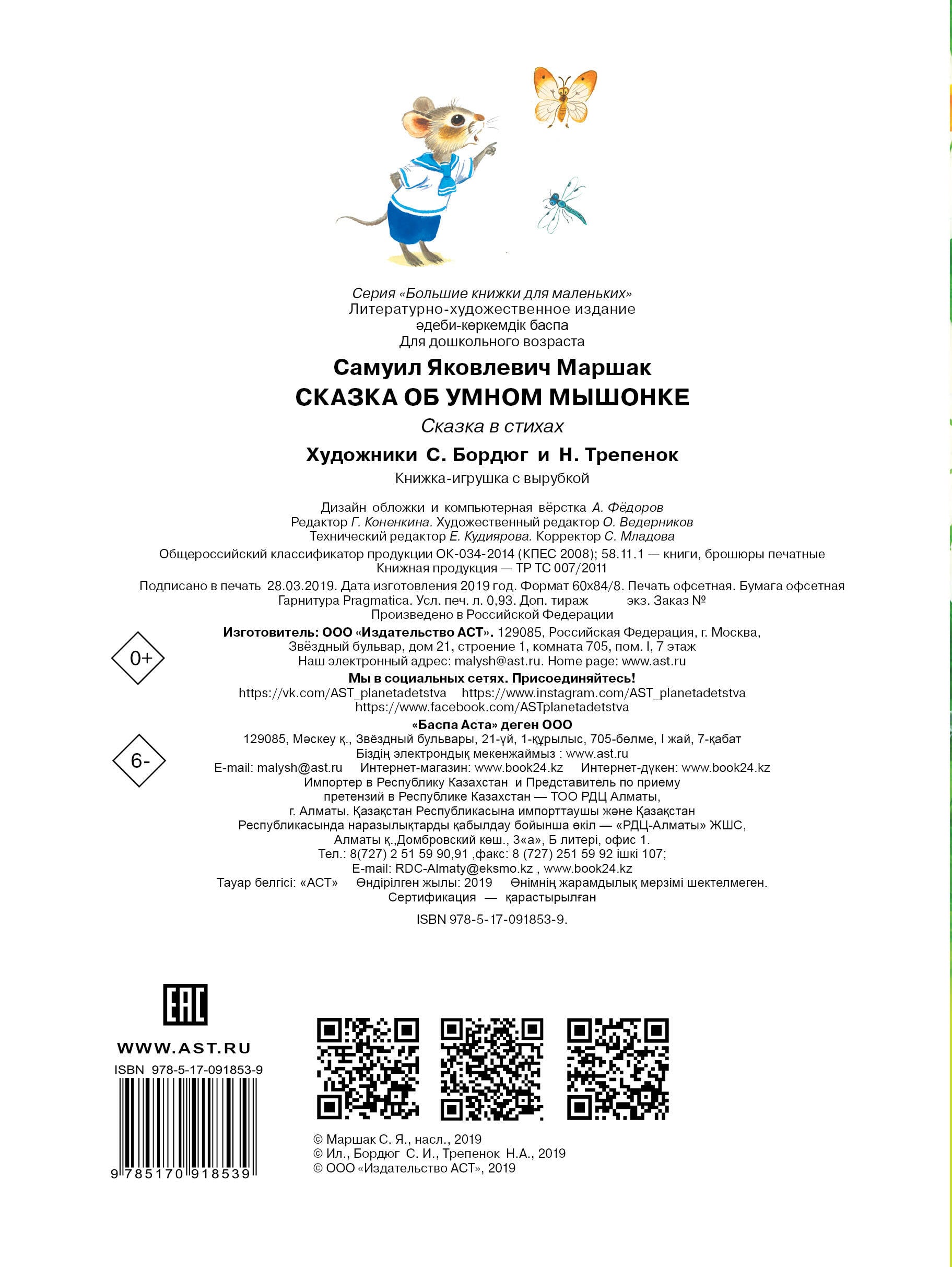 "Сказка о глупом мышонке", которую написал для детей классик детской литературы С. Маршак, давно полюбилась детям и стала хрестоматийной. Малыши с удовольствием слушают её и с лёгкостью запоминают. В книге большие картинки и большие буквы. Иллюстрации известных художников С. Бордюга и Н. Трепенок. Для дошкольного возраста.| Издательство | Издательство "АСТ" |
