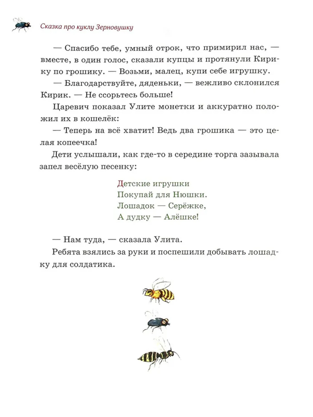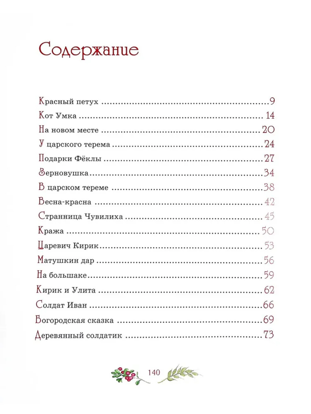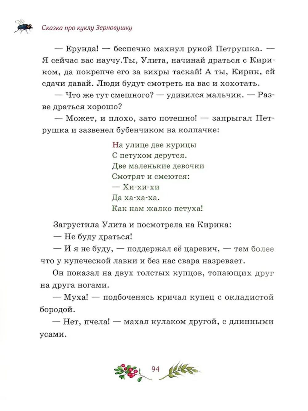 Древняя Русь... Какая она? Эта сказка познакомит читателя с бытом и обычаями старины. Благодаря маленьким игрушкам- бирюлькам и самодельной кукле Зерновушке, героиня этой сказки- девочка Улита переживёт множество чудесных, а иногда и опасных приключений, найдёт новых друзей. Вместе с ней читатель узнает много интересного о жизни древнерусских деревень и спасёт небольшой городок от злого Воеводы. Но главное, он узнает, что зло можно победить только добром, которое обязательно возвращается к тому, кто его творит.| Издательство | Сибирская благозвонница** |