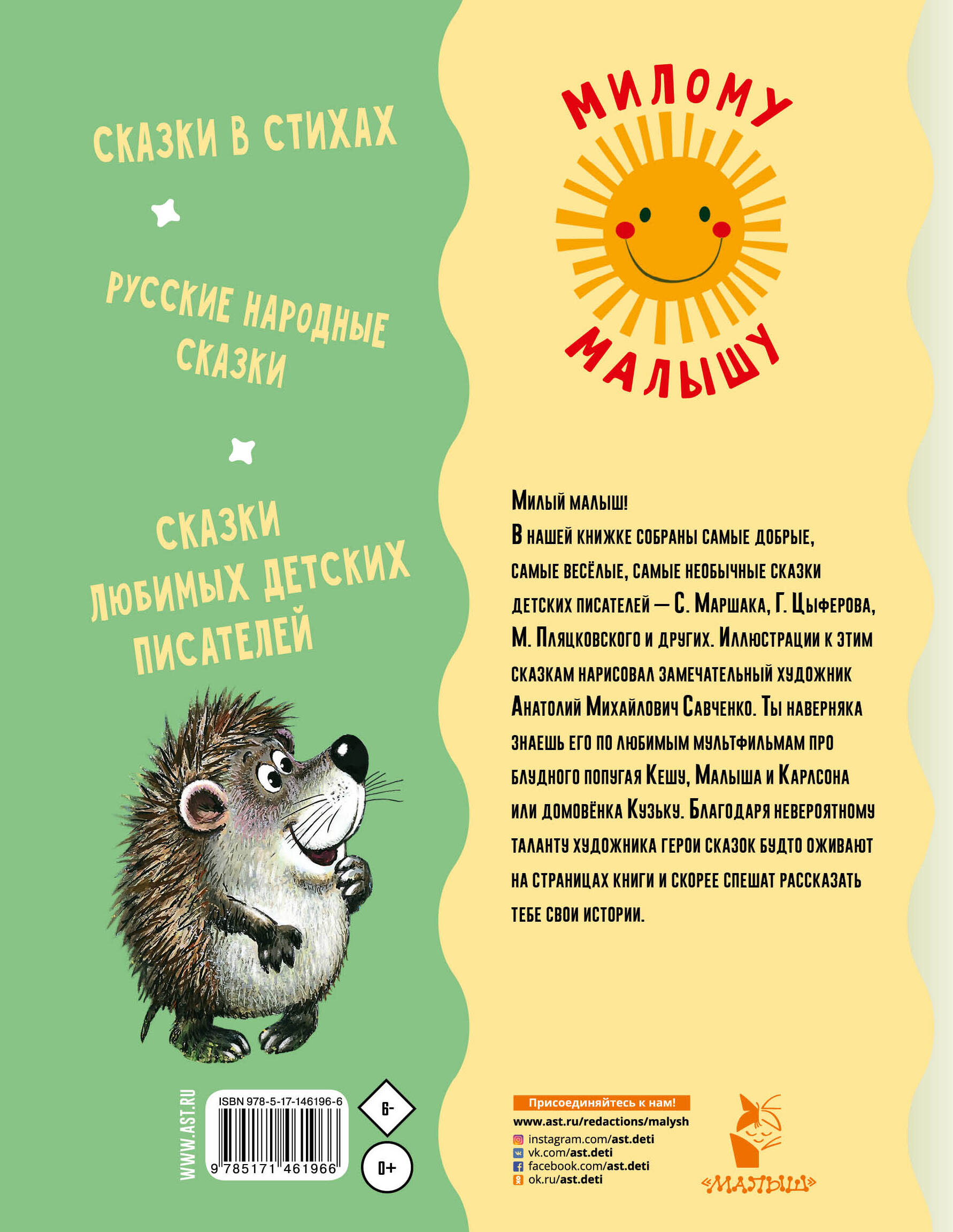 В книгу вошли сказки и стихи классиков детской литературы - С. Маршака, С. Михалкова, Г. Цыферова и других, в рисунках одного из самых известных художников-мультипликаторов Анатолия Михайловича Савченко. Дети прочтут сказки и стихи про Колобка, Козу-Дерезу, Трезора, Умного Мышонка, Вовку, который побывал в Тридевятом царстве, и полюбуются рисунками талантливого, самобытного художника. А. Савченко считал, что персонажи, которых он создает, должны быть "смешными, тёплыми и, самое главное, добрыми". Сборник "Сказка за сказкой" - отличное тому подтверждение. В начале книги есть специальная страничка, где можно написать имя малыша и при желании приклеить фотографию милого крохи! Рисунки А. Савченко. Для дошкольного возраста.| Издательство | ИЗДАТЕЛЬСТВО "АСТ" |