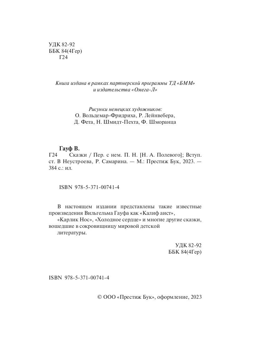 В настоящем издании представлены такие известные произведения Вильгельма Гауфа как "Калиф аист", "Карлик Нос", "Холодное сердце" и многие другие сказки, вошедшие в сокровищницу мировой детской литературы.| Издательство | Престиж Бук |