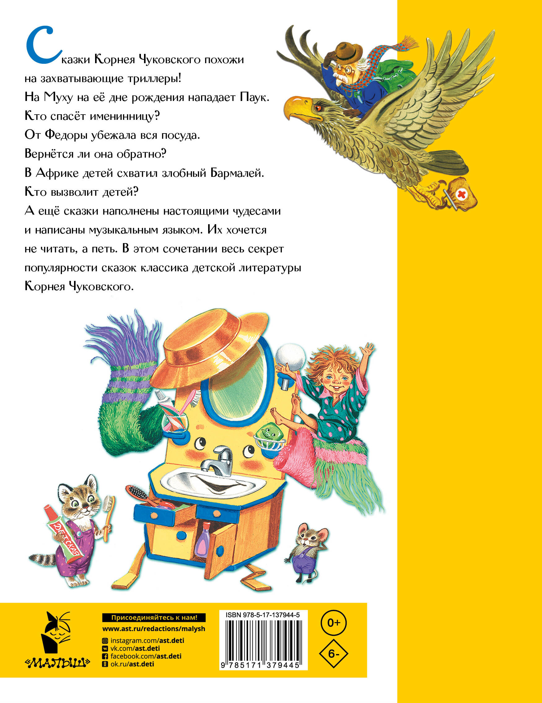 В книгу классика детской литературы Корнея Ивановича Чуковского вошли самые известные сказки: "Муха-Цокотуха", "Тараканище", "Айболит", "Федорино горе" и другие. Истории о Мухе-Цокотухе, грозе детей - Бармалее, добром докторе Айболите читают маленькие дети уже около века! Корней Иванович Чуковский долгие годы остаётся самым читаемым детским писателем в России. Его сказки не только увлекут интересным сюжетом и особым языком, но и помогут развить воображение и расскажут о доброте, милосердии, храбрости, заботе и чистоплотности. Рисунки С. Бордюга и Н. Трепенок. Для дошкольного возраста.| Издательство | Издательство "АСТ" |