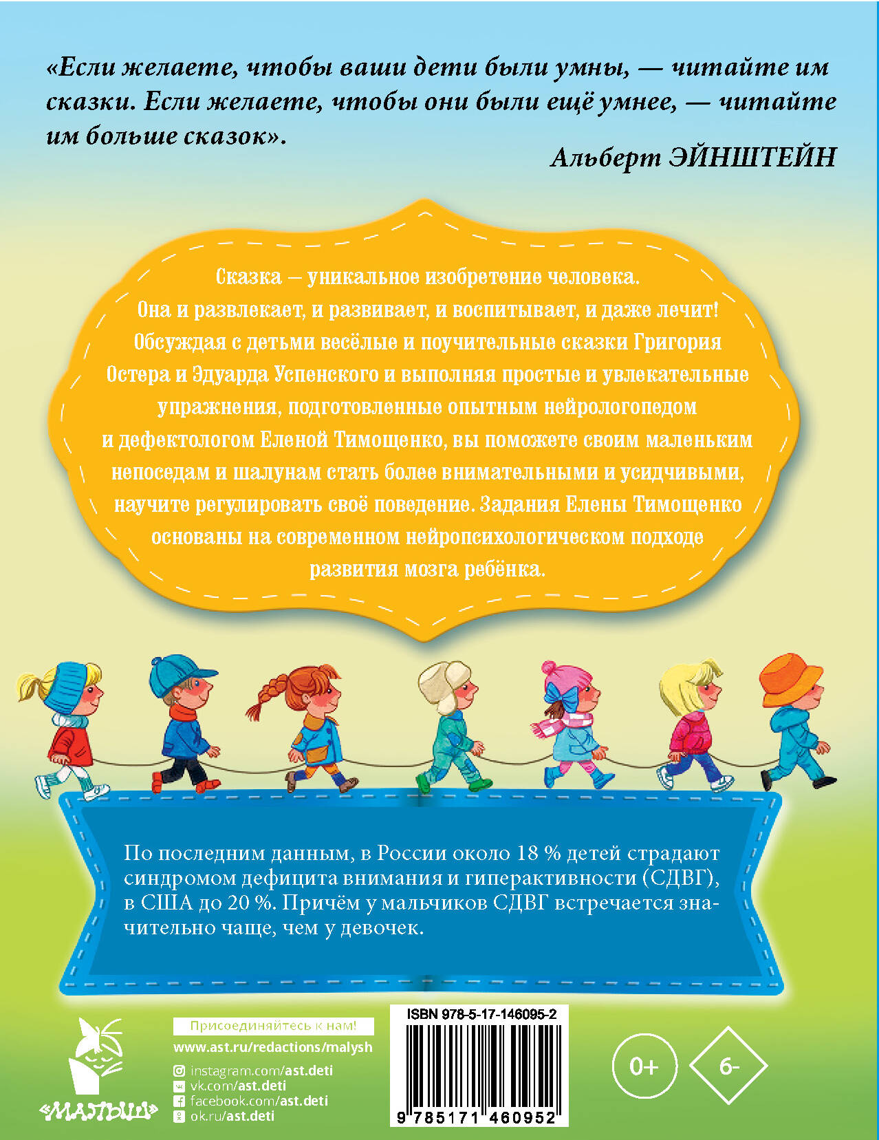 Сказка - уникальное изобретение человека. Она и развлекает, и развивает, и воспитывает, и даже лечит! Обсуждая с детьми весёлые и поучительные сказки Григория Остера и Эдуарда Успенского и выполняя простые и увлекательные упражнения, подготовленные опытным нейрологопедом и дефектологом Еленой Тимощенко, вы поможете своим маленьким непоседам и шалунам стать более внимательными и усидчивыми, научите регулировать своё поведение. Подход Елены Тимощенко основан на современном нейропсихологическом методе развития мозга ребёнка. Для дошкольного возраста.| Издательство | ИЗДАТЕЛЬСТВО "АСТ" |
