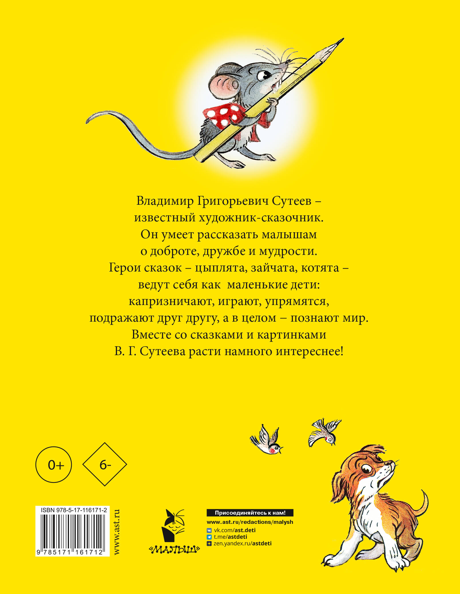 Владимир Григорьевич Сутеев - известный художник-сказочник. Он умеет рассказать малышам о доброте, дружбе и мудрости. Герои сказок - цыплята, зайчата, котята - ведут себя как маленькие дети: капризничают, играют, упрямятся, подражают друг другу, а в целом − познают мир. Вместе со сказками и картинками В. Г. Сутеева расти намного интереснее!| Издательство | ИЗДАТЕЛЬСТВО "АСТ" |