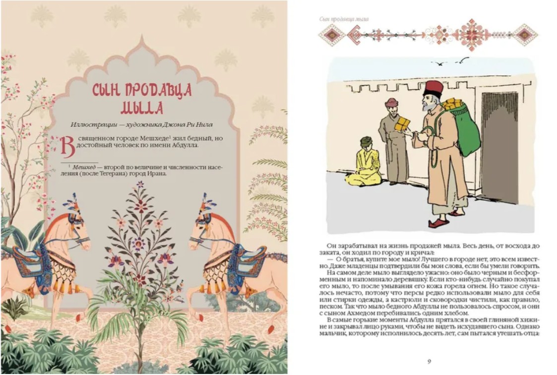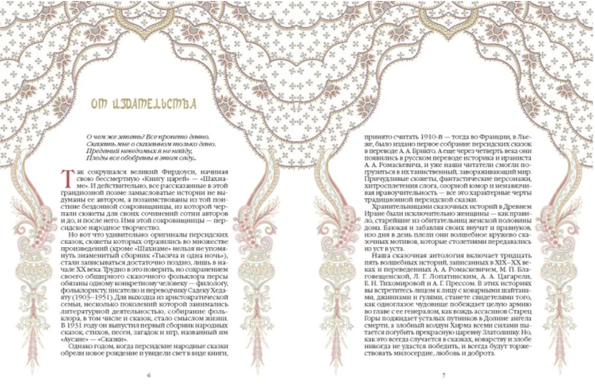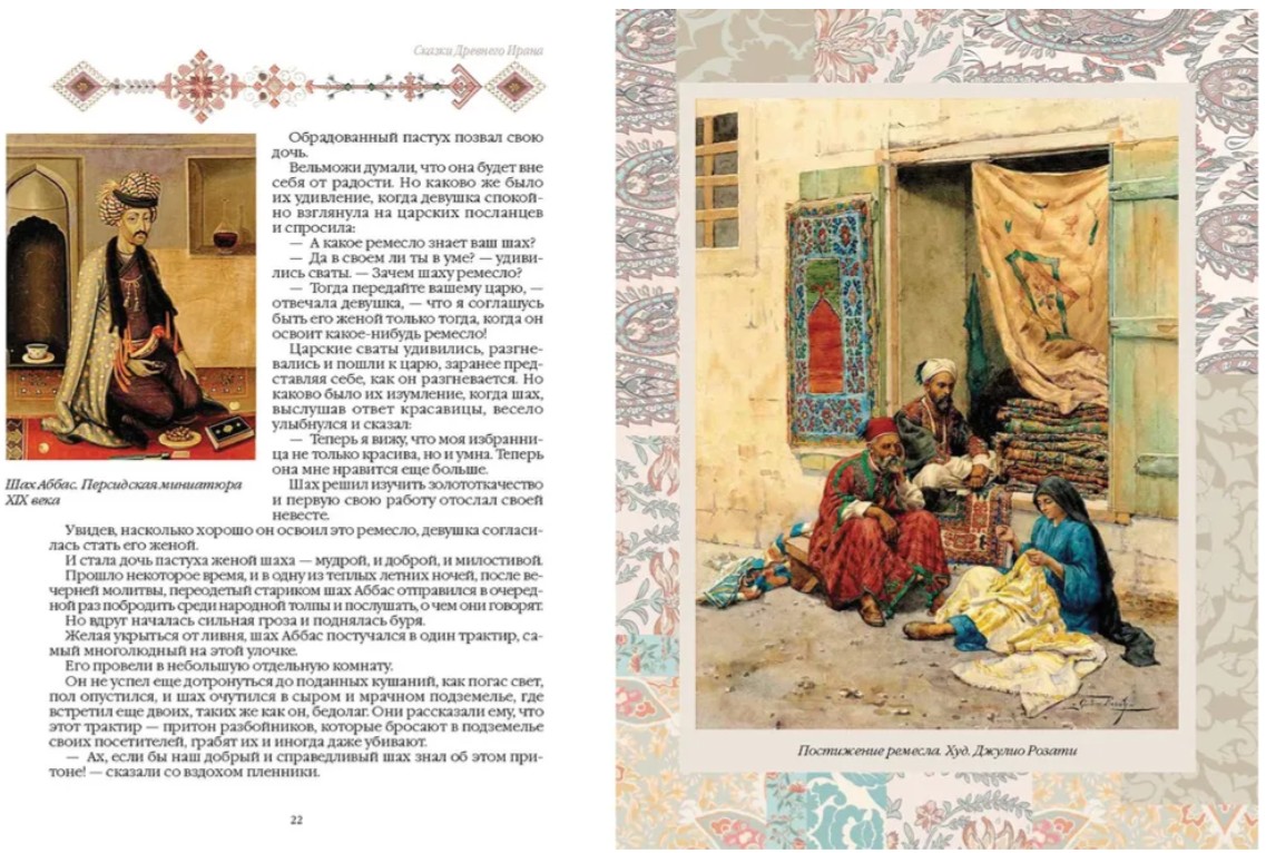 Иранские сказки и предания, рожденные на земле древней Персии, - один из источников сюжетов для сказочников всего мира. Они отразились не только в легендарном собрании «Тысяча и одна ночь» или в среднеазиатских историях о Ходже Насреддине, но и в творениях европейских писателей. Тридцать пять волшебных историй в переводах А. А. Ромаскевича, М. П. Благовещенской, Л. Г. Лопатинского, А. А. Цагарели, Е. Н. Тихомировой и др. дадут возможность не только окунуться в стихию фольклора Ирана, но и познакомят с традициями и культурой этой великой страны. Мир иранских сказок наполнен удивительными существами и событиями: здесь правят бал коварные шайтаны, джинны и гули, одноглазое чудовище побеждает целую армию во главе с ее генералом, Старец Горы поджидает усталых путников в Долине ангела смерти, а злобный колдун Хирма пытается погубить прекрасную царевну Златолипку. Дивную сказочную атмосферу дополняют произведения персидских художников Ризы Аббаси, Кемаледдина Бехзада, Михра Али, Абуль Хасана Гаффари, Ибрагима Хадим Баята, а также роскошные персидские миниатюры XVI-XIX веков и картины европейских мастеров.