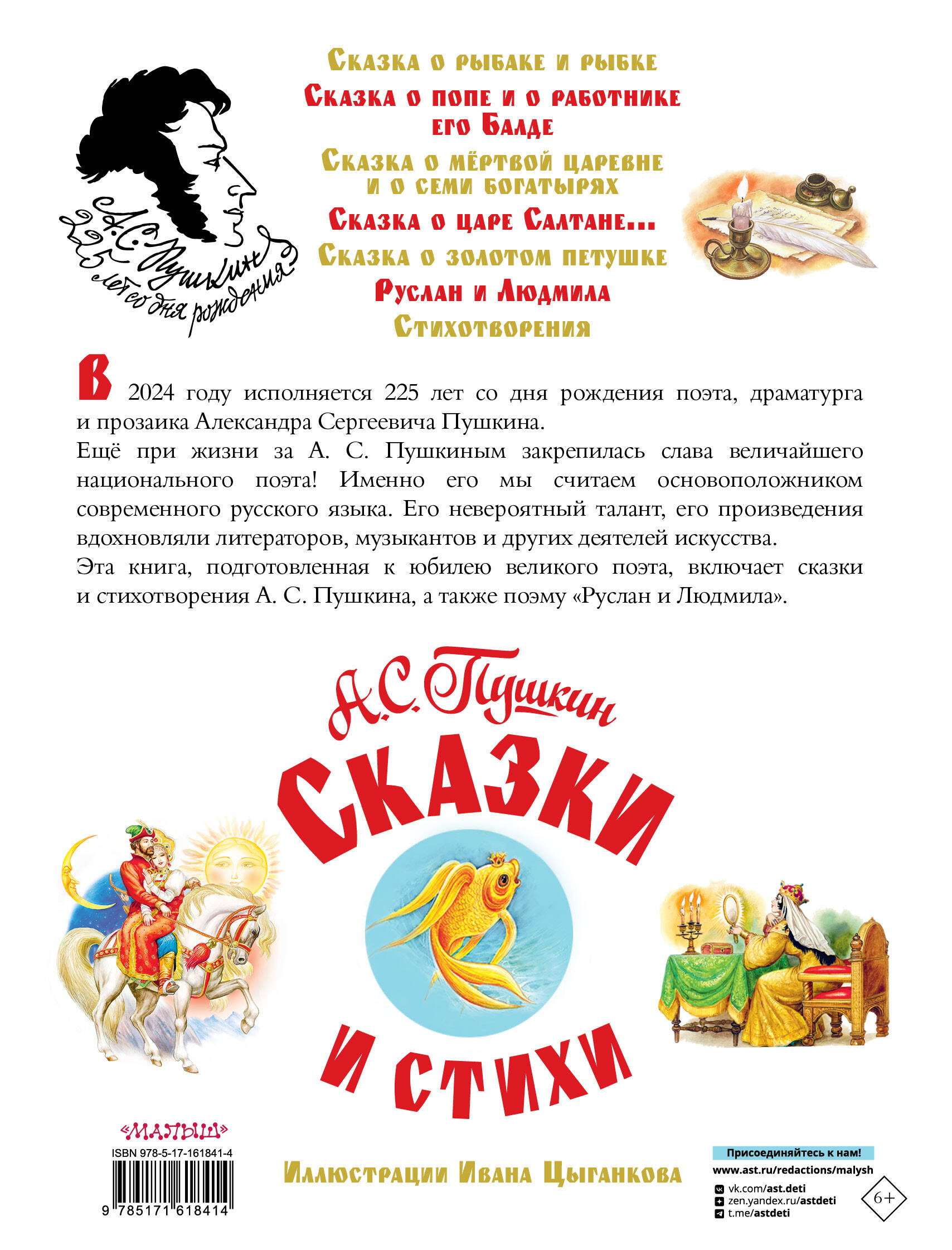В 2024 году исполняется 225 лет со дня рождения поэта, драматурга и прозаика Александра Сергеевича Пушкина. Ещё при жизни за А. С. Пушкиным закрепилась слава величайшего национального поэта! Именно его мы считаем основоположником современного русского языка. Его невероятный талант, его произведения вдохновляли литераторов, музыкантов и других деятелей искусства. Эта книга, подготовленная к юбилею великого поэта, включает сказки и стихотворения А. С. Пушкина, а также поэму «Руслан и Людмила».