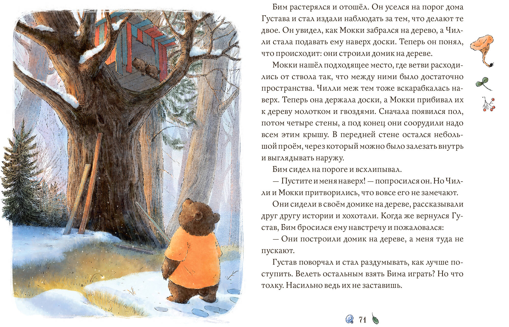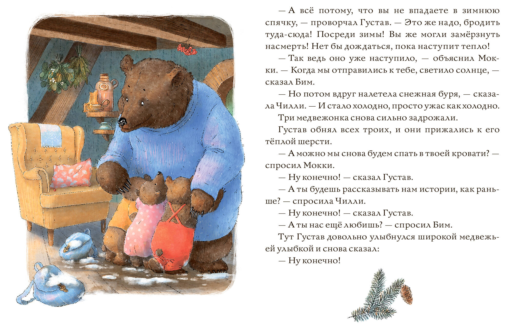 Медведь по имени Густав жил один в своем уютном медвежьем домике. Но однажды кто-то постучался к нему в дверь. Да это же вернулись три медвежонка - Чилли, Мокки и Бим! Они замерзли по дороге и снова попросились пожить у Густава. Днем медведь Густав варит для них кашу и печет блины, а еще придумывает много разных игр и учит сочинять стихи. А вечером рассказывает трем медвежатам истории - про то, как он был маленьким, про свою сестренку Ольгу, нахального кузена Барри, строгого дядю Адальбера и тетю Бертруду, которая любила собирать всякую всячину. Небольшие истории можно читать детям вслух снова и снова. Рассказы о жизни медведей чередуются со сказкой перед сном. Фишки книги: - Тильде Михельс - классик немецкой литературы для детей, обладательница множества престижных литературных премий. - Книга, на которой выросли несколько поколений. Теперь с книгами Тильде Михельс могут познакомиться и российские читатели. - Уютные, добрые и нескучные истории, в которых дети узнают себя. - Идеальный формат для чтения вслух перед сном. - Классика немецкой детской литературы с новыми, добрыми и сказочными, иллюстрациями русской художницы Елизаветы Третьяковой. - Подходит как для мальчиков, так и для девочек с трех лет. - Для поклонников серий "Тильда Яблочное Семечко" и "Лапин". - Традиционные ценности и преодоление конфликтов. - Перевод Анны Торгашиной, финалиста премии Чуковского. Для кого эта книга: Для детей от 3 лет. Для поклонников серий "Тильда Яблочное Семечко" и "Лапин".