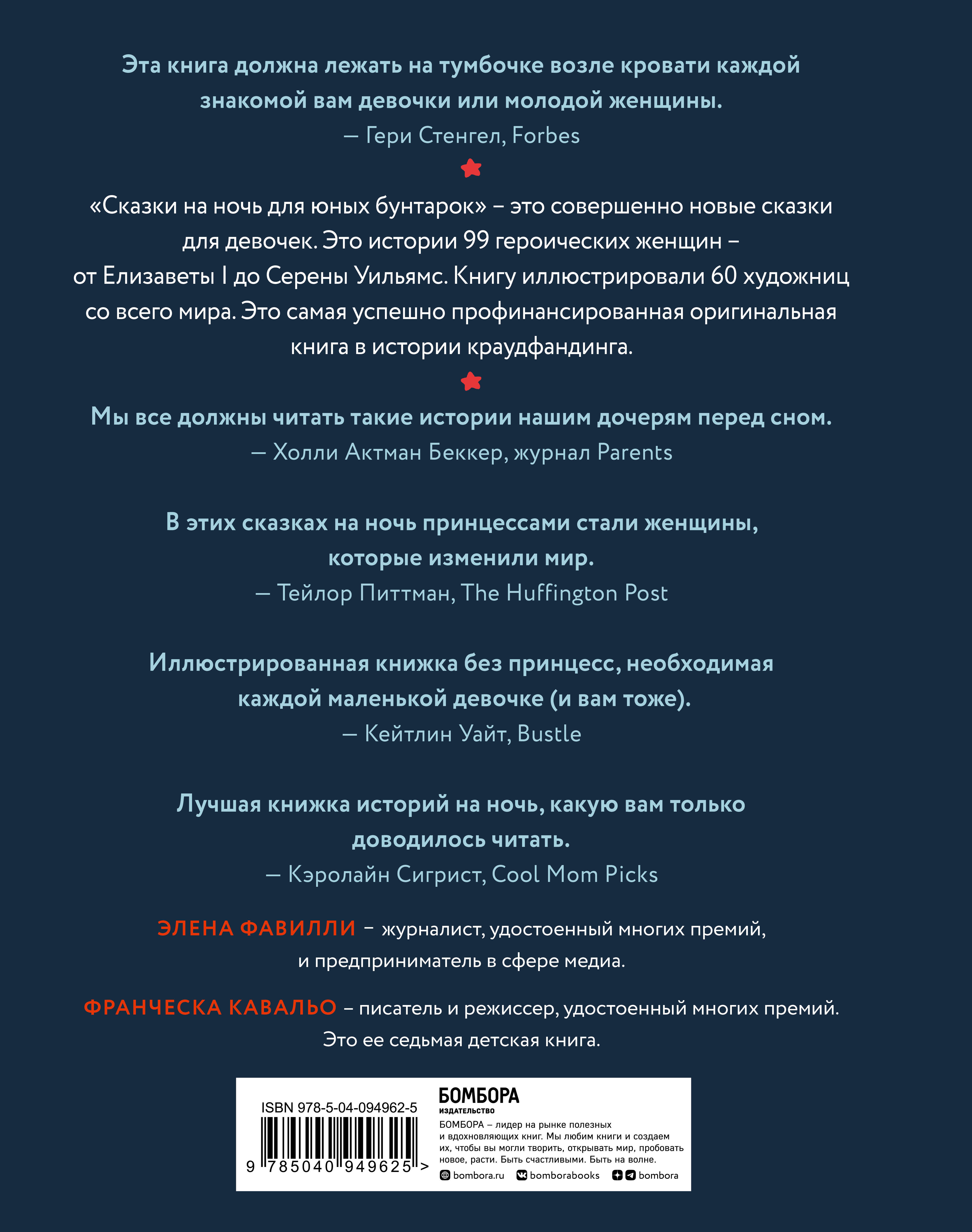 Что делать, если прекрасный принц не может помочь с химической лабораторией? К кому идти за помощью, если удача повернулась спиной? Как жить, если родители решили выдать замуж, а тебе хочется грабить корабли в море? Ответ прост - всё уже есть в вас самих, и нужно держаться своего курса. Перед вами - огромный источник жизненных сил и вдохновения. Множество сказок, написанных на основе реальных историй о смелых и необыкновенных женщинах-новаторах (Коко Шанель, Екатерина Великая, Клеопатра, Анна Политковская, Фрида Кало), сумевших выйти за рамки и справиться с невзгодами собственными силами, не оставят равнодушными юных бунтарок-мечтательниц и их мам! Для кого - Для тех, кто хочет изменить этот мир и сделать его свободнее. - Для тех, кто хочет быть самим собой вне зависимости от предубеждений. Отзыв «Коротенькие рассказы, проливающие свет на жизнь необыкновенных женщин, преодолевших трудности и перешагнувших через предубеждения, рассказанные просто и вдохновляюще, но без нравоучительности и навязчивости. Эта книга помогла мне обсудить сложные вопросы брака, половой идентификации и личностного восприятия с моими детьми. Единственное, что я бы поменял - написал не "для юных бунтарок", а "о девочках-бунтарках", так как она подходит и для мальчиков, и для родителей тоже». - Booktime on amazon.com| Издательство | ООО "Издательство "Эксмо" |