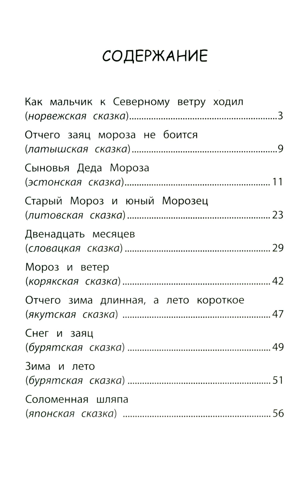 В сборник вошли сказки разных народов: норвежцев, латышей, эстонцев, литовцев, словаков, коряков, якутов, бурятов, японцев. Вы найдёте здесь сказки про зиму и лето, про мороз и ветер, про приключения Марушки в зимнем лесу, про путешествие храброго мальчика в зимние владения Северного ветра. Любите сказки, читайте сказки детям, чтобы они росли и набирались мудрости вместе с героями сказок!| Издательство | Феникс |
