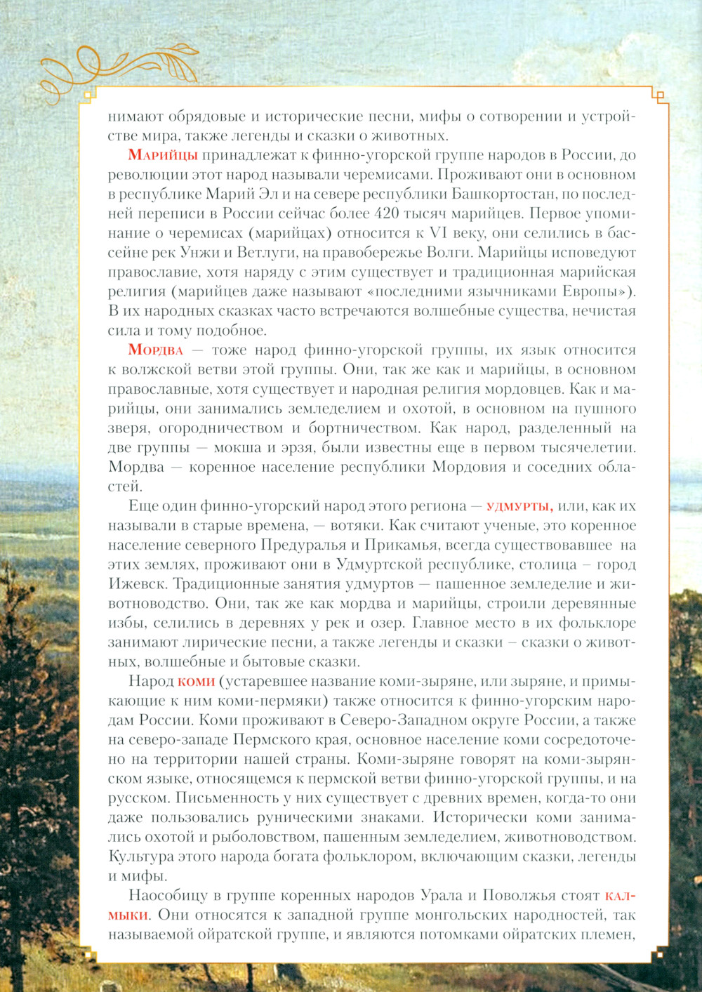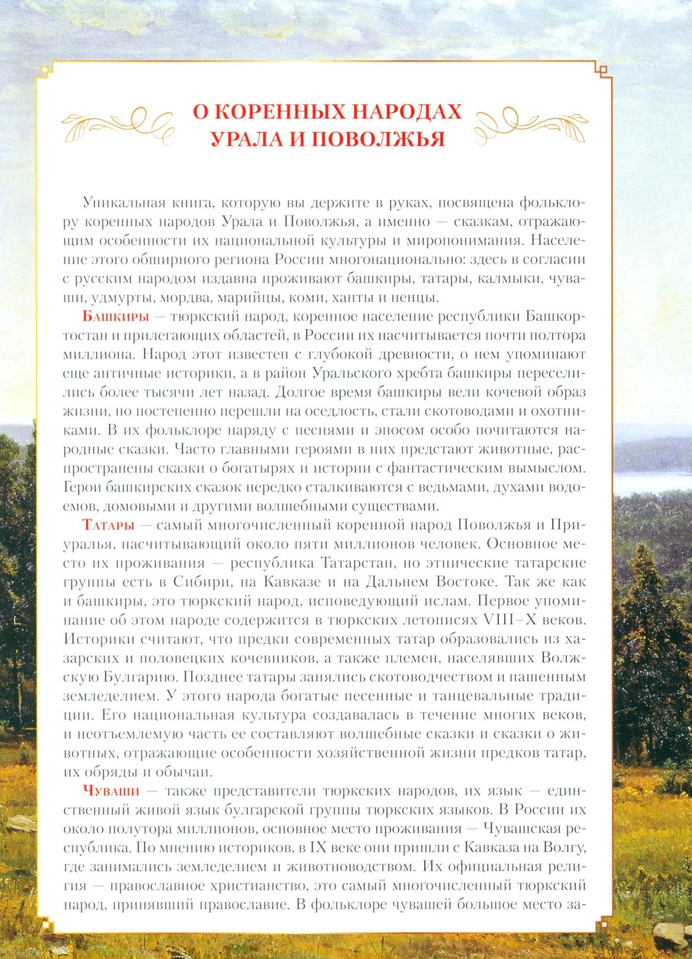 Предания седого Урала знакомы большинству из нас лишь по сказам Павла Бажова - но в нашей книге впервые собраны подлинные народные сказки, вдохновлявшие автора «Малахитовой шкатулки». Уникальный сборник объединил сказки десяти коренных народов Урала и Поволжья - башкир, татар, калмыков, удмуртов, марийцев, мордвы, чувашей, коми, хантов и ненцев. В книге собраны шестьдесят увлекательных, но незнакомых большинству читателей волшебных сказок, в которых обитают самые удивительные волшебные существа - лешие и водяные, злые колдуны и коварные ведьмы, а противостоят им храбрые батыры и мудрые прекрасные девушки. Также в издание включены сказки и истории о животных, рожденные неповторимой и богатой природой Урала и Поволжья.