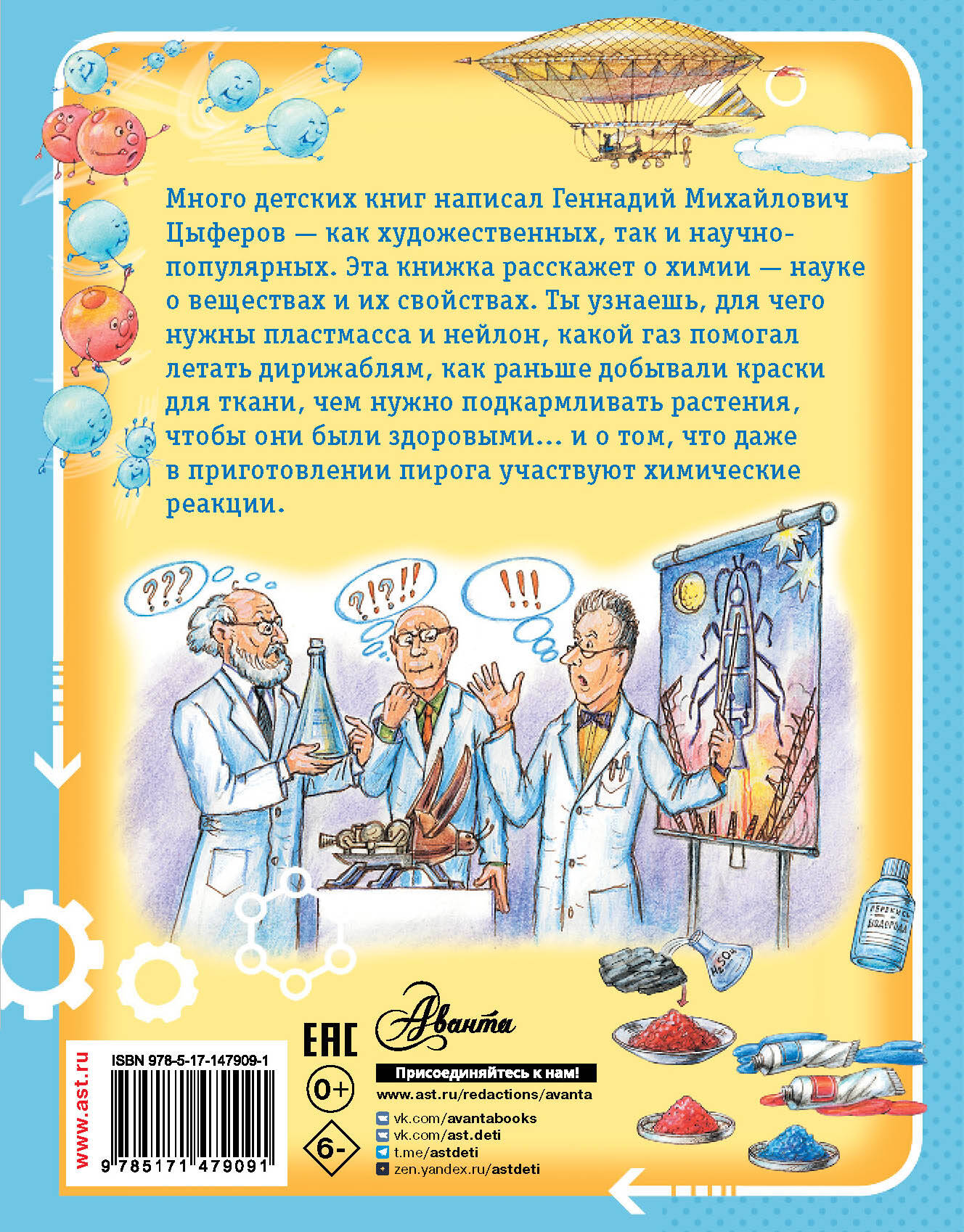 Книга Геннадия Михайловича Цыферова "Сказки о химии" познакомит детей с интереснейшими химическими реакциями, происходящими вокруг нас, и с веществами, из которых производят одежду, шины машин, корабли и здания, удобрения для растений. Вы узнаете, как защищается от врагов жук-бомбардир, как сделать батарейку из сахара, для чего биологу Флемингу понадобились слёзы, как канарейка спасала жизни шахтёрам… и многое другое! Для младшего школьного возраста.| Издательство | ИЗДАТЕЛЬСТВО "АСТ" |