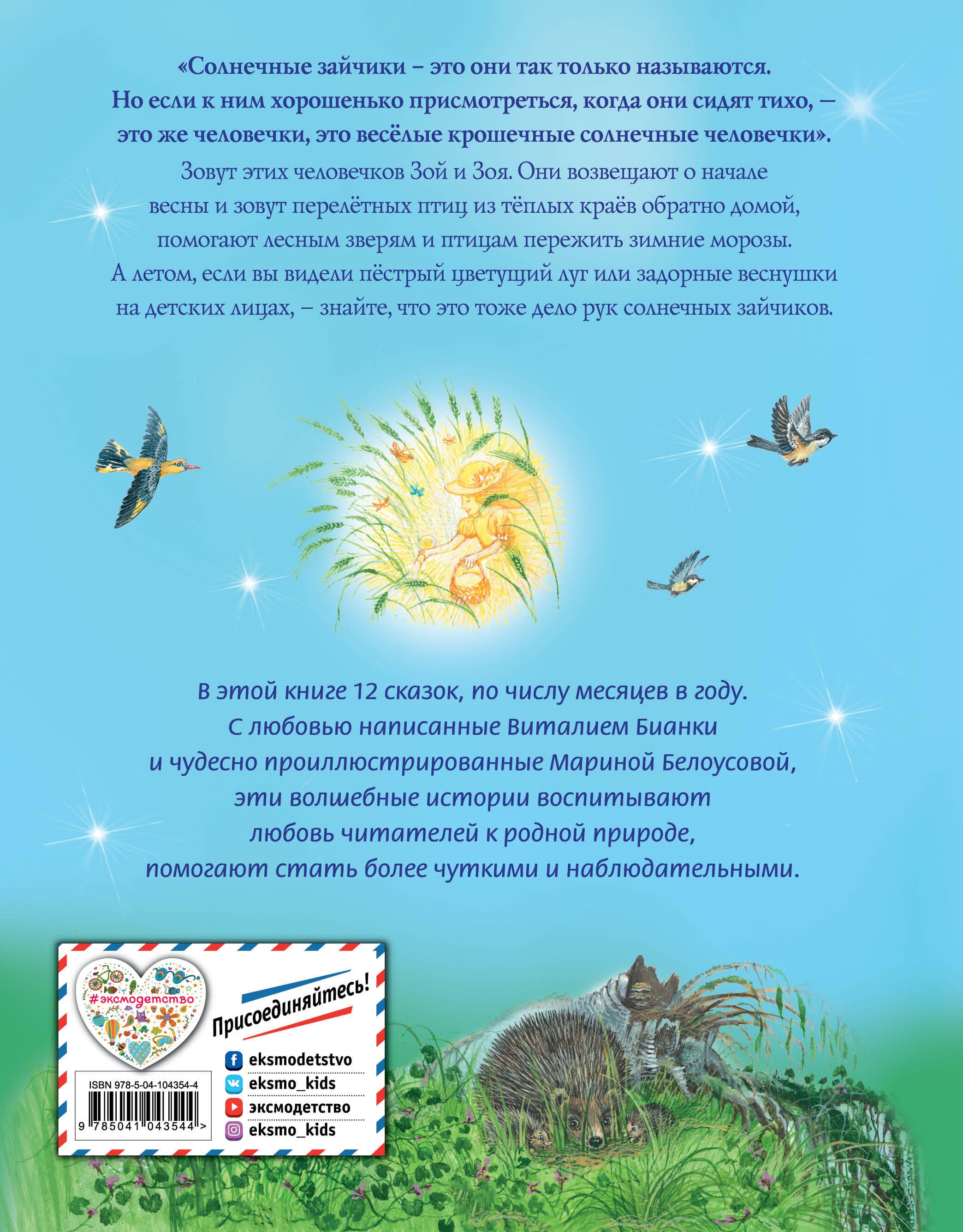 «Солнечные зайчики - это они так только называются. Но если к ним хорошенько присмотреться, когда они сидят тихо, - это же человечки, это весёлые крошечные солнечные человечки». Зовут этих человечков Зой и Зоя. Они возвещают о начале весны и зовут перелётных птиц из тёплых краев обратно домой, помогают лесным зверям и птицам пережить зимние морозы. А летом, если вы видели пёстрый цветущий луг или задорные веснушки на детских лицах - знайте, что это тоже дело рук солнечных зайчиков. В этой книге 12 сказок, по числу месяцев в году. С любовью написанные Виталием Бианки и чудесно проиллюстрированные Мариной Белоусовой, эти волшебные истории воспитывают любовь читателей к родной природе, помогают стать более чуткими и наблюдательными.| Издательство | ООО "Издательство "Эксмо" |