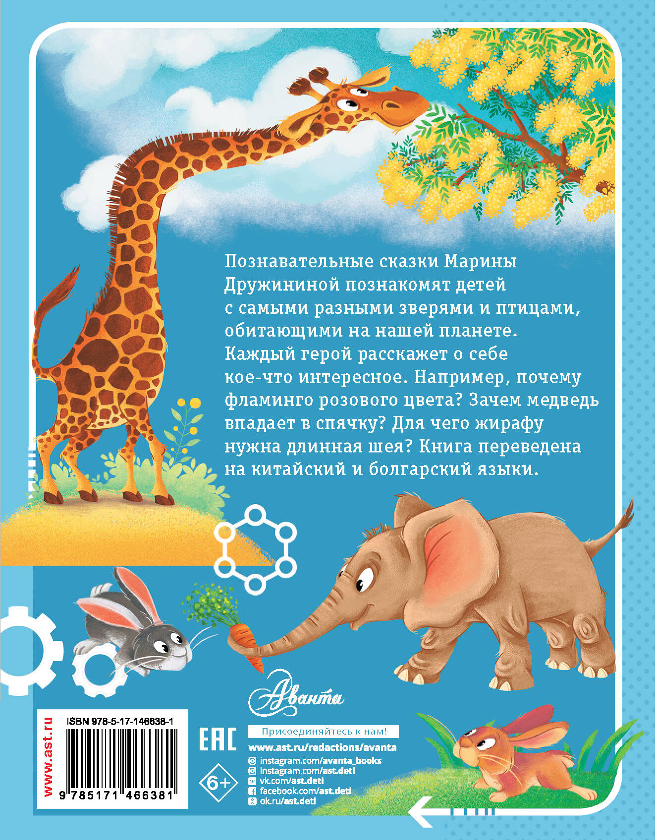 "Сказки о животных" - это сборник смешных и познавательных сказок известной писательницы Марины Дружининой. Герои книги - заяц, медведь, кит, жираф, пеликан, гусь, пингвин и другие звери и птицы - рассказывают о себе и узнают о своих товарищах много интересного: например, какие звери - чемпионы по скорости, у кого самые большие глаза, зачем жирафу длинная шея, почему медведь зимой спит, для чего заяц меняет окраску, и многое-многое другое. Прекрасные иллюстрации Веры Зайцевой понравятся малышам! Для младшего школьного возраста.| Издательство | АСТ |