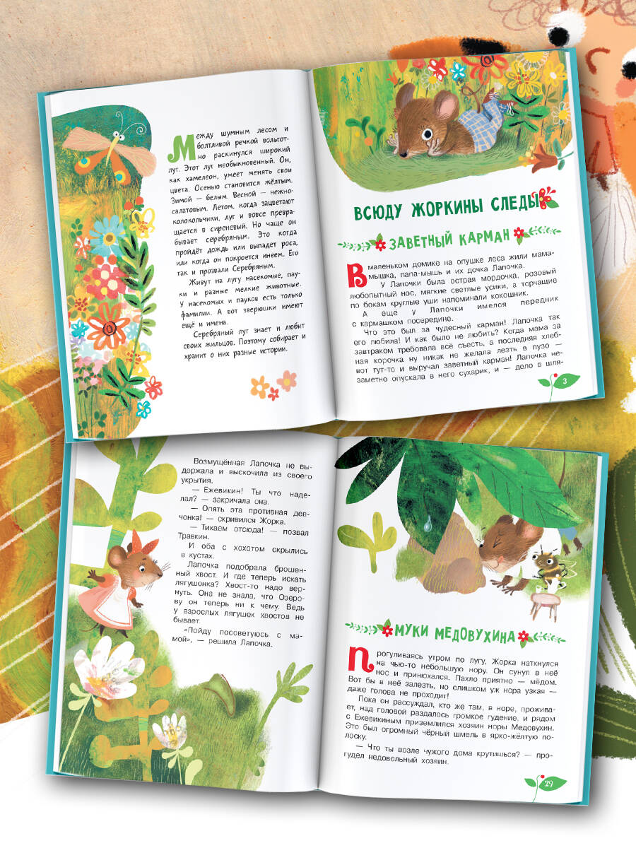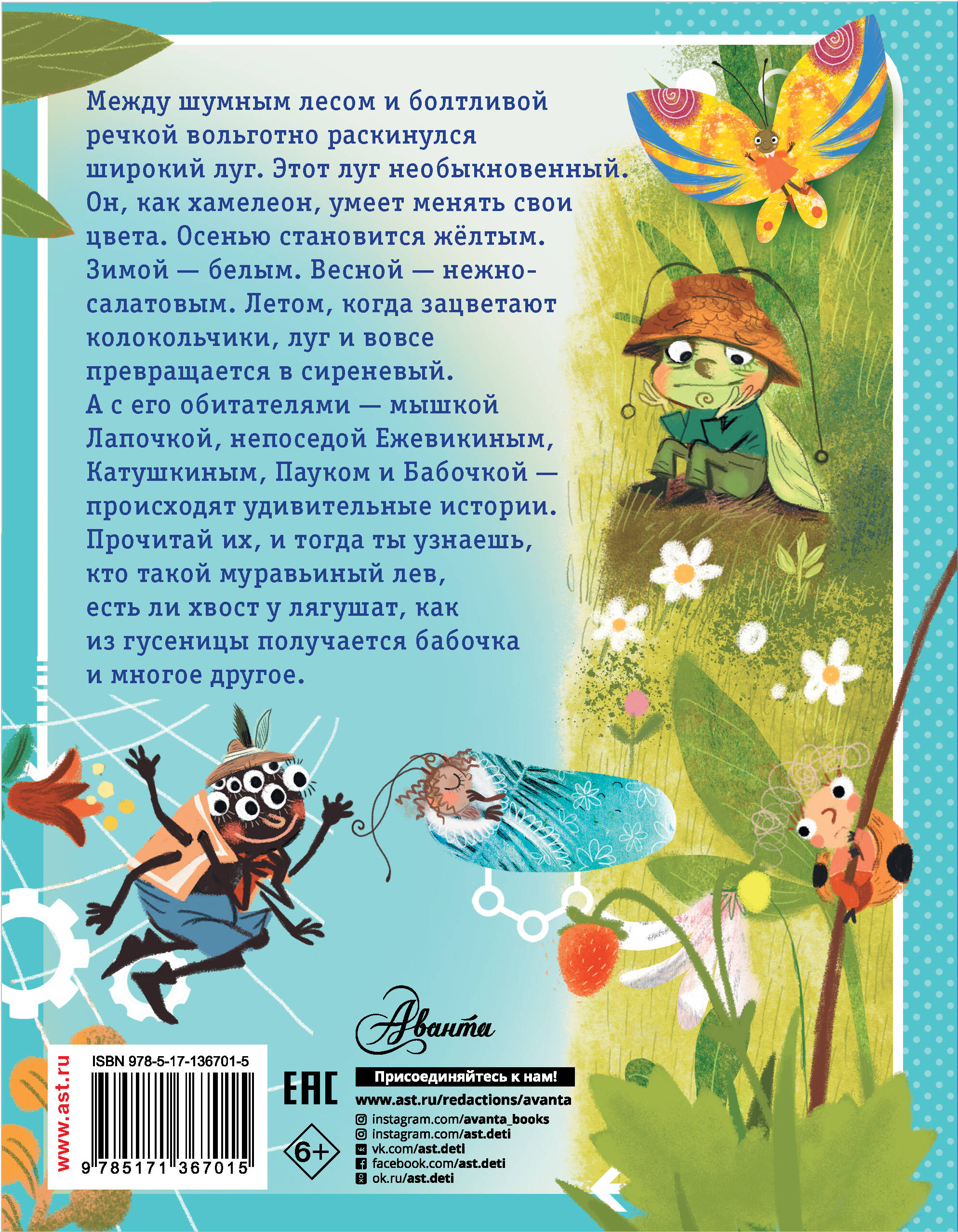 Между шумным лесом и болтливой речкой вольготно раскинулся широкий луг. Этот луг необыкновенный. Он, как хамелеон, умеет менять свои цвета. Он бывает жёлтым, нежно-салатовым, белым, сиреневым и даже серебряным. А с его обитателями - мышкой Лапочкой, непоседой Ежевикиным, Катушкиным, Пауком и Бабочкой - происходят удивительные истории, из которых ты узнаешь, как найти настоящих друзей, кто такой муравьиный лев, есть ли хвост у лягушат, как из гусеницы получается бабочка, умеет ли паучок летать… и многое-многое другое. Для младшего школьного возраста.| Издательство | ИЗДАТЕЛЬСТВО "АСТ" |