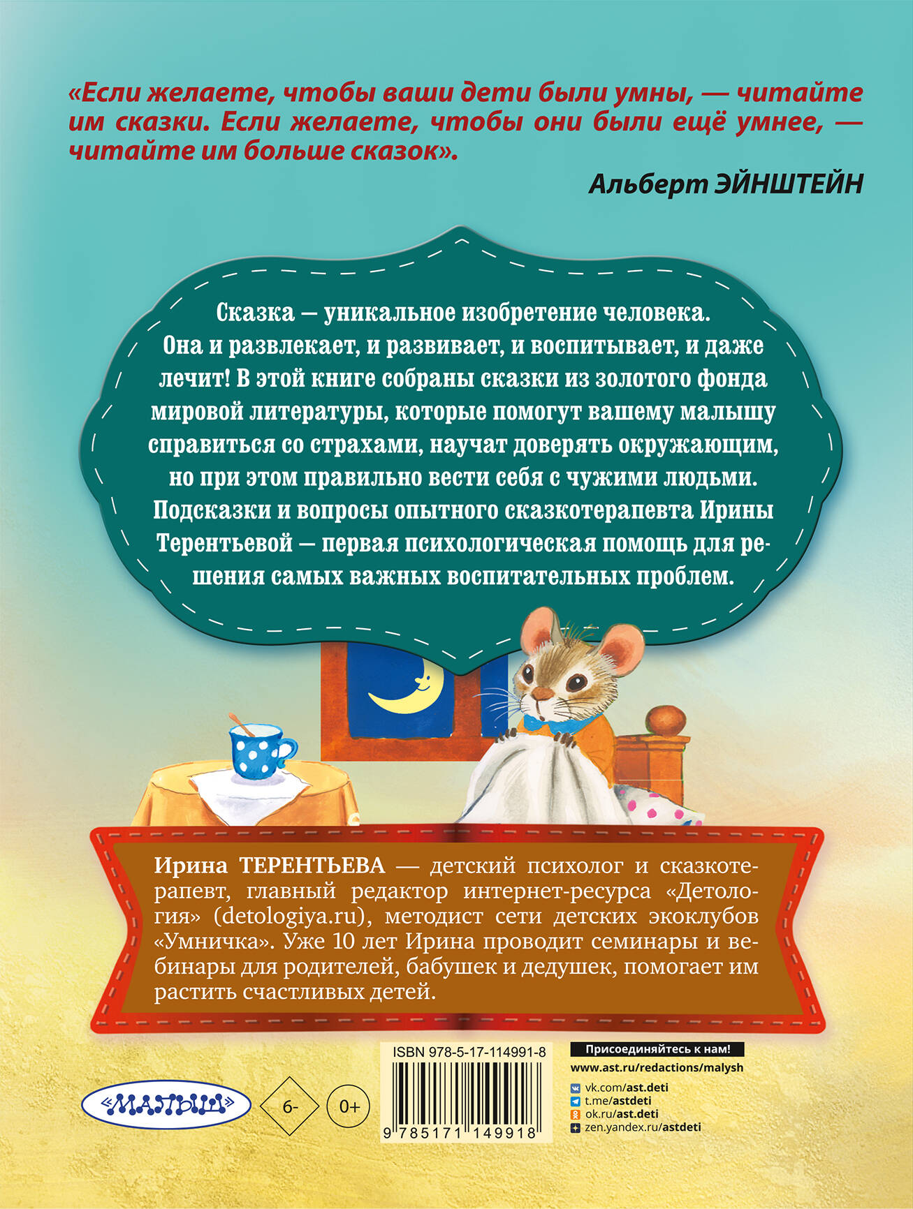 Сказки от страхов - это сборник волшебных историй из золотого фонда детской литературы с подсказками опытного психолога-сказкотерапевта Ирины Терентьевой. Всего в книге пять историй: русская народная «Чудище-горынище», а также сказки Ушинского, Толстого, Маршака и Бианки. Для каждой сказки указано время чтения и предложены вопросы для обсуждения, которые помогут ребёнку понять и преодолеть то, что его беспокоит.| Издательство | ИЗДАТЕЛЬСТВО "АСТ" |
