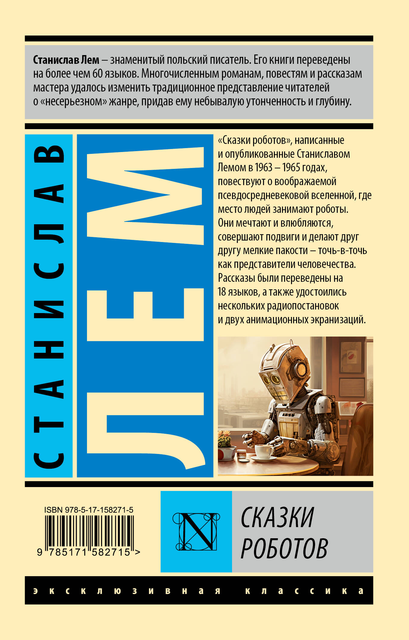 "Сказки роботов", написанные и опубликованные Станиславом Лемом в 1963 - 1965 годах, повествуют о воображаемой псевдосредневековой вселенной, где место людей занимают роботы. Они мечтают и влюбляются, совершают подвиги и делают друг другу мелкие пакости - точь-в-точь как представители человечества. Рассказы были переведены на 18 языков, а также удостоились нескольких радиопостановок и двух анимационных экранизаций.| Издательство | Издательство "АСТ" |