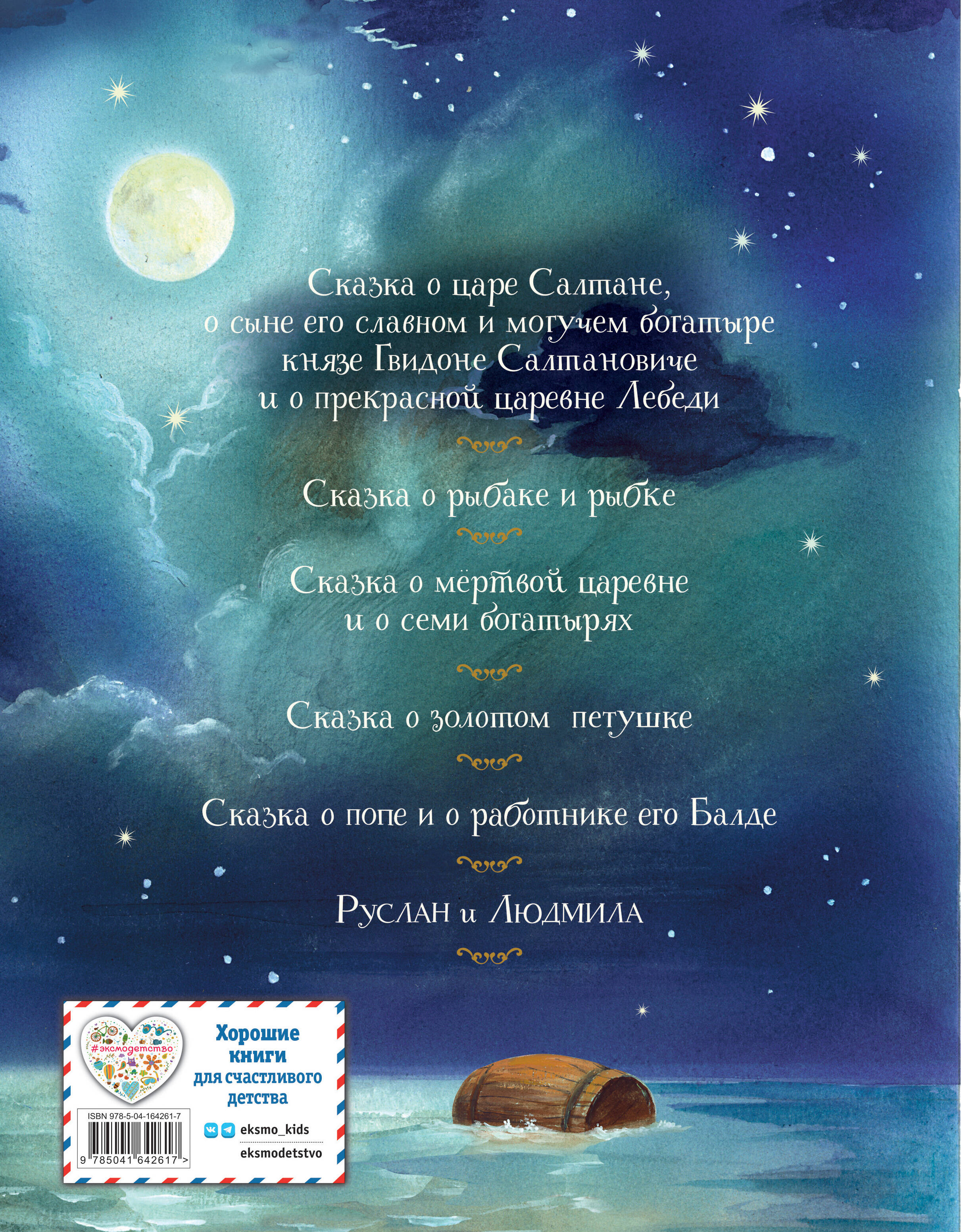 Сказка - ложь, да в ней намёк! Добрым молодцам урок. Написанные почти два столетия назад знаменитые стихотворные сказки Александра Сергеевича Пушкина остаются любимыми историями, без которых немыслимо детство. Ведь они создали уникальный и волшебный мир, в котором обитают и былинные русские герои, и славные девицы-красавицы, и могущественные волшебники, и необыкновенные фантастические существа: русалки, нечистая сила, огромная живая голова и ещё многие-многие другие удивительные герои. В них, несмотря на всевозможные препятствия и козни врагов, всегда побеждают добро и справедливость, и они ни капельки не страшные. А ещё богатый и выразительный язык сказок расширяет словарный запас, развивает воображение и закладывает основу для духовного развития ребёнка. ДЛЯ КОГО - Для детей, любящих сказки, волшебство и приключения. - Для родителей, которые заботятся о культурном воспитании своих детей. - Для чтения в кругу семьи. ОСОБЕННОСТИ КНИГИ - В книгу вошли самые известные сказочные произведения Александра Пушкина: пять стихотворных сказок и волшебная поэма «Руслан и Людмила». - Сказочные и изысканные иллюстрации известной российской художницы Анны Власовой. - Твёрдый переплёт с тиснением, плотная белая бумага и комфортный для чтения шрифт. - Отличный подарок для ребёнка любого возраста. - Идеальный вариант для семейного чтения или чтения ребёнку перед сном.| Издательство | ООО "Издательство "Эксмо" |