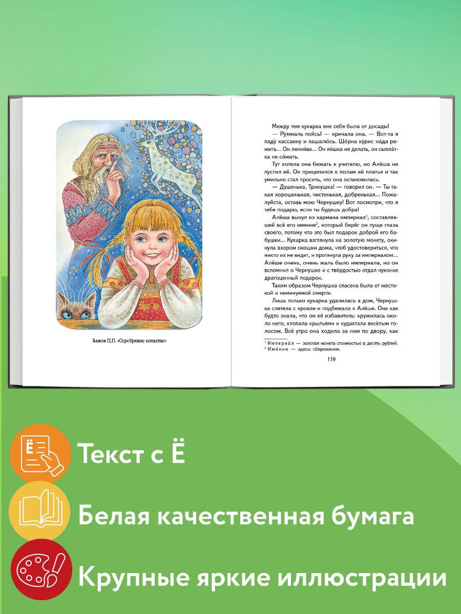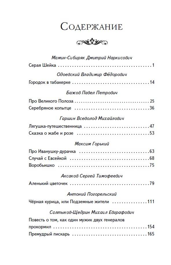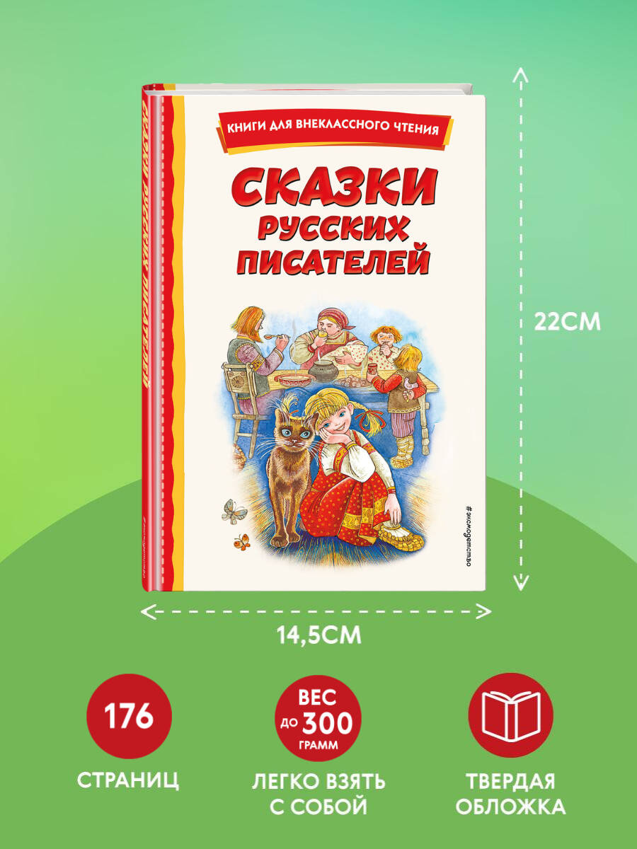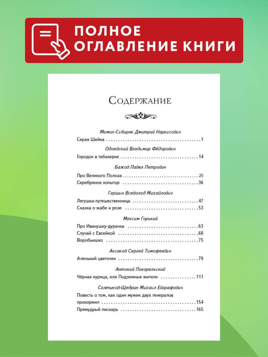 Серия «Книги для внеклассного чтения» - это подборка главных произведений русских и зарубежных авторов, входящих в школьную программу. Лучшие произведения детской литературы с цветными иллюстрациями помогут привить ребёнку любовь к чтению. В этой книге представлены сказки великих русских писателей, написанные на основе оригинальных и народных сюжетов, в том числе «Серая шейка» Д.Н. Мамина-Сибиряка, «Городок в табакерке» В.Ф. Одоевского, «Серебряное копытце» П.П. Бажова, «Аленький цветочек» А. Погорельского и др. Сборник поможет ребёнку познакомиться с лучшими произведениями этого жанра и увидеть его многогранность. А сказки, проверенные временем, станут крепкой основой для нравственного воспитания детей, обогатят речь и помогут привить любовь к родной культуре. Благодаря удобному формату и твёрдому переплёту книгу удобно носить с собой. Издание может быть использовано для чтения в школе и дома.| Издательство | ООО "Издательство "Эксмо" |