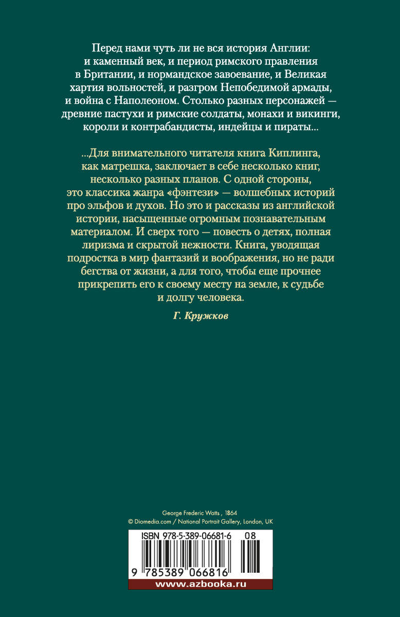 Редьярд Киплинг - знаменитый писатель, поэт и новеллист, первый англичанин, получивший Нобелевскую премию по литературе. Пожалуй, редко у кого столь удачно складывалась литературная судьба: произведения Киплинга восторженно принимались критикой, гонорары оказывались рекордными, при жизни автора было издано четыре собрания сочинений - случай поистине уникальный. "Пак с волшебных холмов" и "Подарки фей", составившие настоящий сборник, наряду с "Книгами джунглей", - самые знаменитые произведения Киплинга. Уже при жизни писателя они были переведены на двадцать семь языков! В увлекательных рассказах проказливого эльфа Пака сплетаются воедино фольклор, сказки, мифология и история, создавая неповторимую атмосферу старой доброй Англии.| Издательство | Азбука-Аттикус Издат.группа ООО |