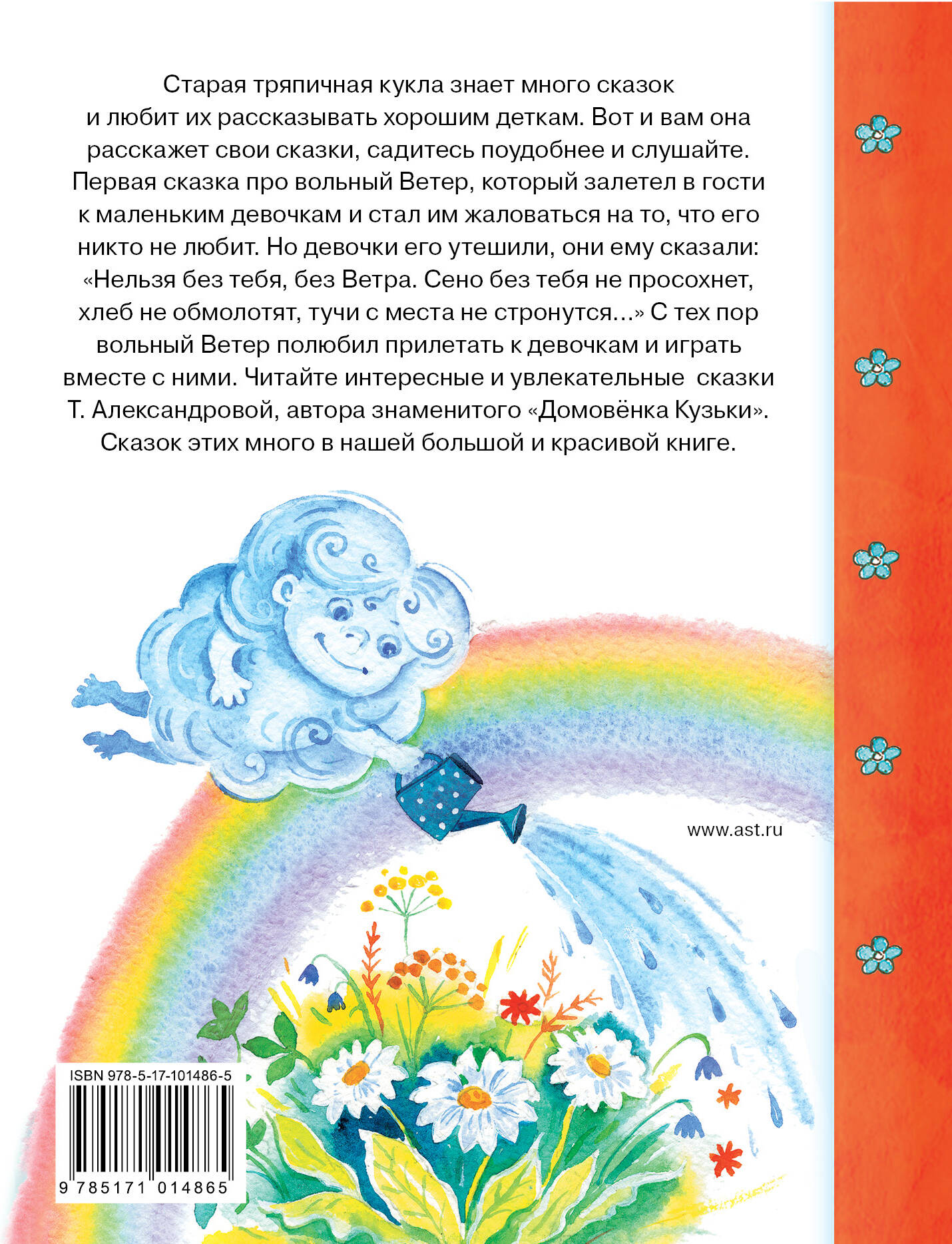 Старая тряпичная кукла знает много сказок и любит их рассказывать хорошим деткам. Вот и вам она расскажет свои сказки, садитесь поудобнее и слушайте. Первая сказка про вольный Ветер, который залетел в гости к маленьким девочкам и стал им жаловаться на то, что его никто не любит. Но девочки его утешили, они ему сказали: «Нельзя без тебя, без Ветра. Сено без тебя не просохнет, хлеб не обмолотят, тучи с места не стронутся...» С тех пор вольный Ветер полюбил прилетать к девочкам и играть вместе с ними. Читайте интересные и увлекательные сказки Т. Александровой, автора знаменитого «Домовёнка Кузьки». Сказок этих много в нашей большой и красивой книге.| Издательство | ИЗДАТЕЛЬСТВО "АСТ" |