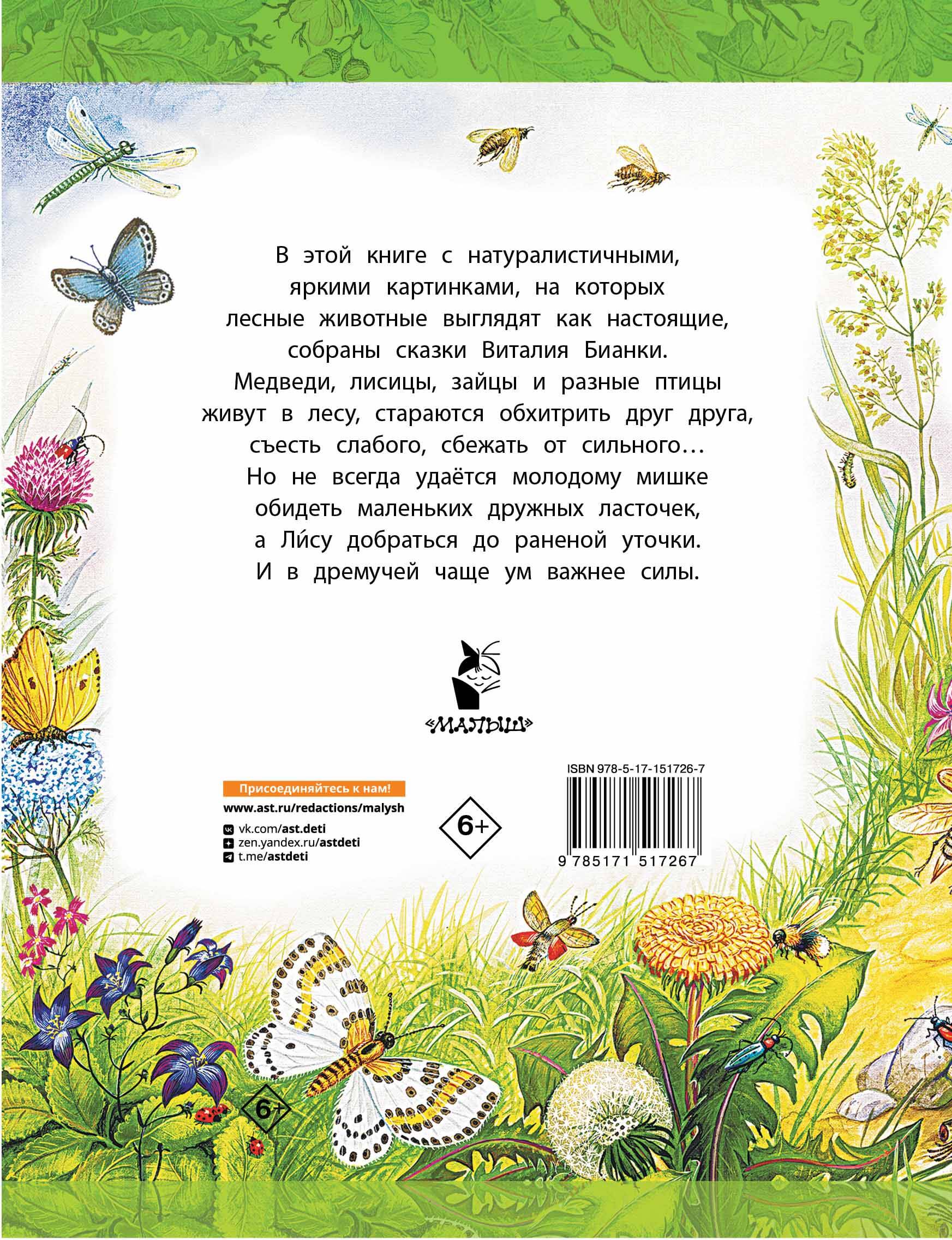 В этой книге с натуралистичными, яркими картинками, на которых лесные животные выглядят как настоящие, собраны сказки Виталия Бианки. Медведи, лисицы, зайцы и разные птицы живут в лесу, стараются обхитрить друг друга, съесть слабого, сбежать от сильного… Но не всегда удаётся молодому мишке обидеть маленьких дружных ласточек, а Ли2су добраться до раненой уточки. И в дремучей чаще ум важнее силы.| Издательство | ИЗДАТЕЛЬСТВО "АСТ" |